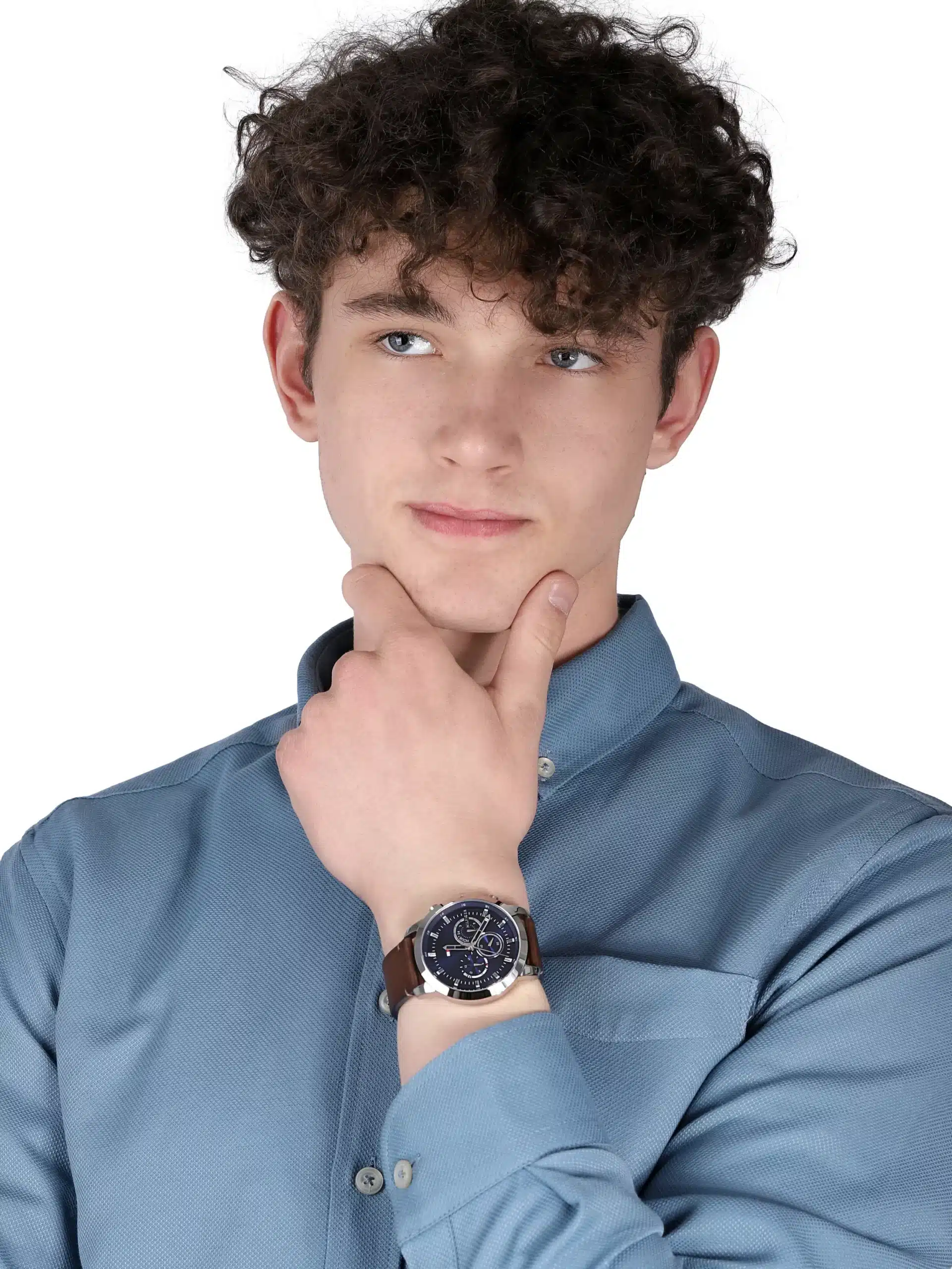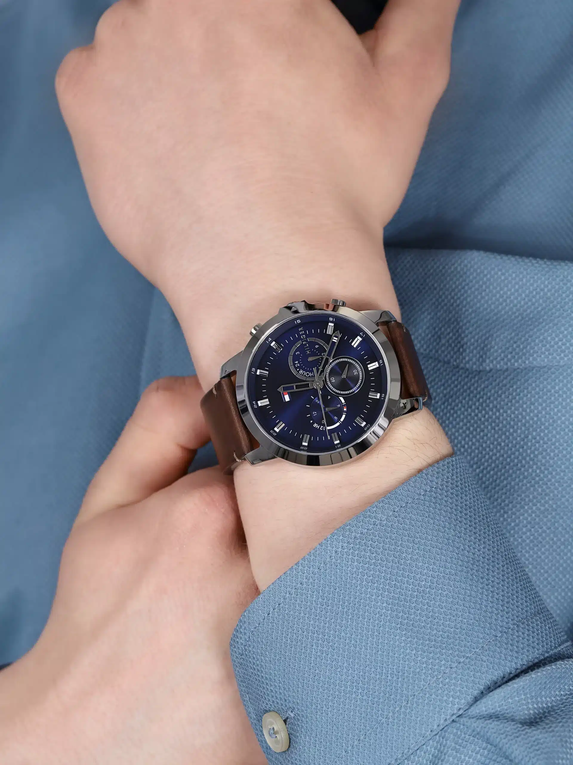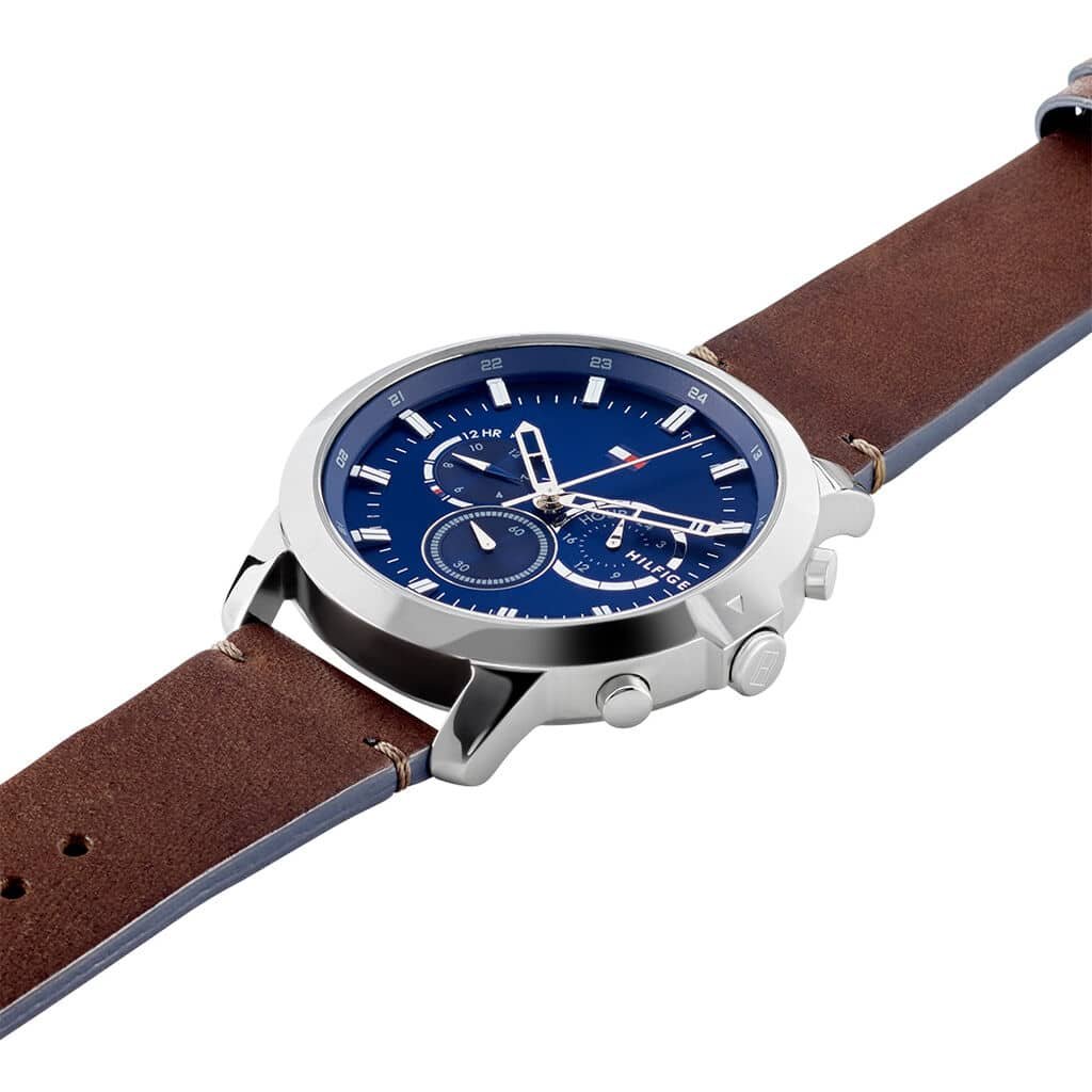 ساعة تومي هيلفيغر للرجال اصلية موديل (كوير) Cuir 1791797 بلون ازرق واستيك جلد لون بني