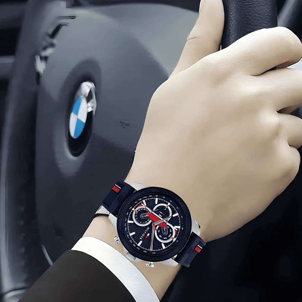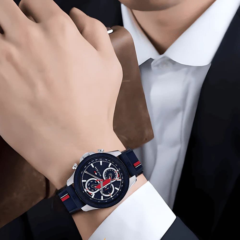 - مينا أزرق متين وعصري: تتميز الساعة بمينا أزرق جذاب يجمع بين الأناقة والوضوح، مما يجعل الوقت سهل القراءة في جميع الظروف، اللون الأزرق يعطي الساعة لمسة من الفخامة والتفرد.