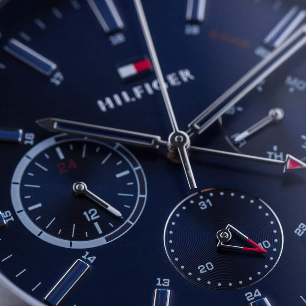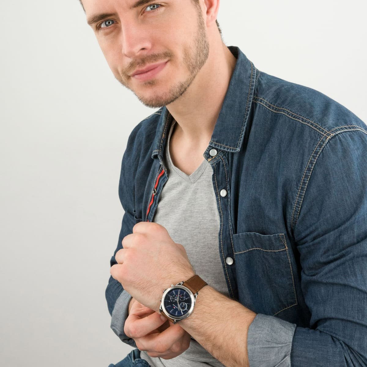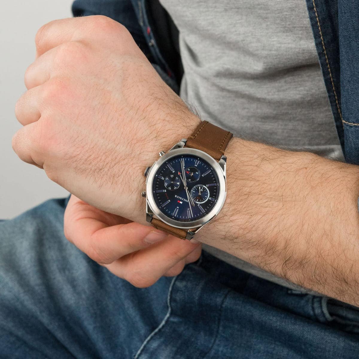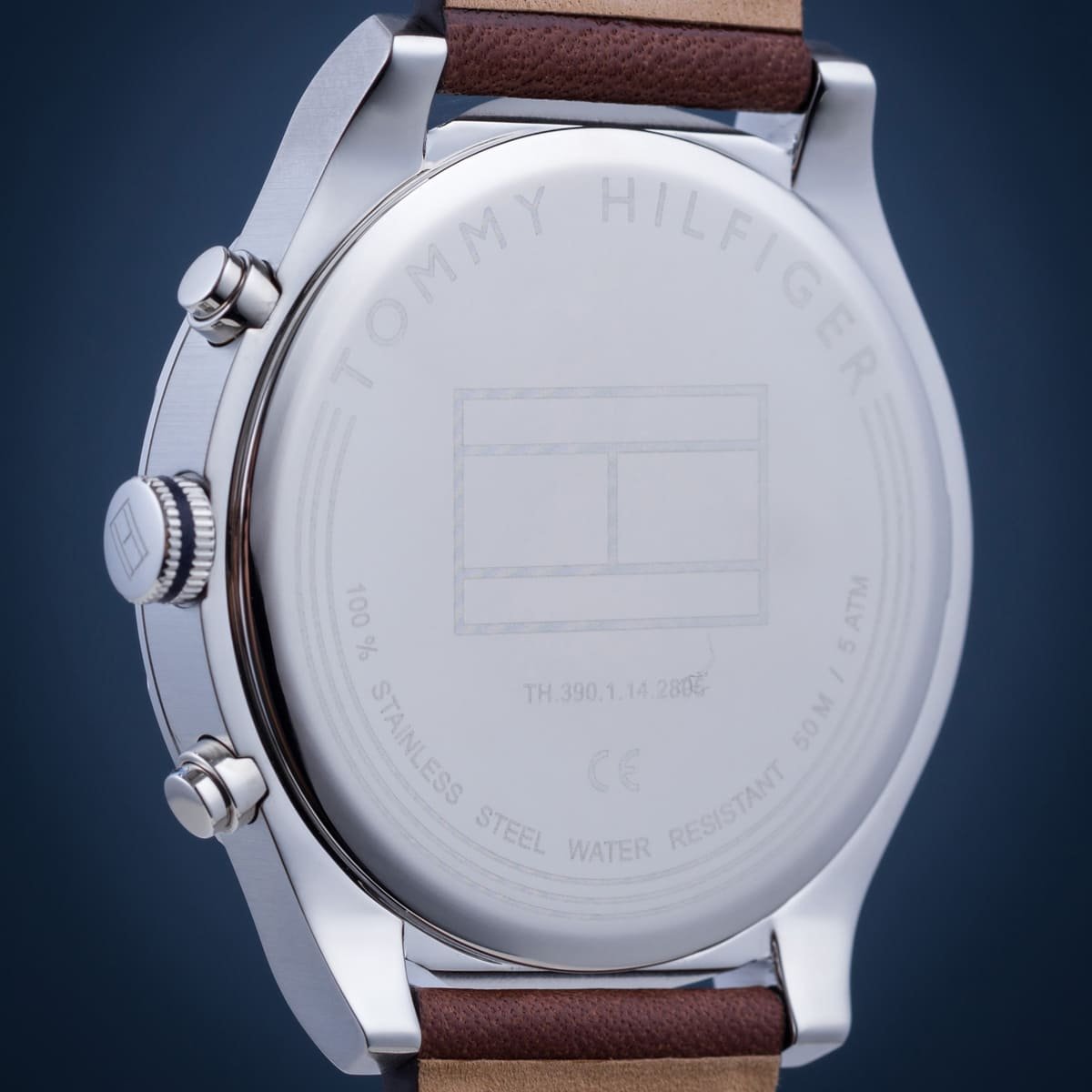 ساعة تومي هيلفيغر رجالي أصلية موديل (اشتون) Ashton 1791741 بلون ازرق و استيك جلد بلون بني