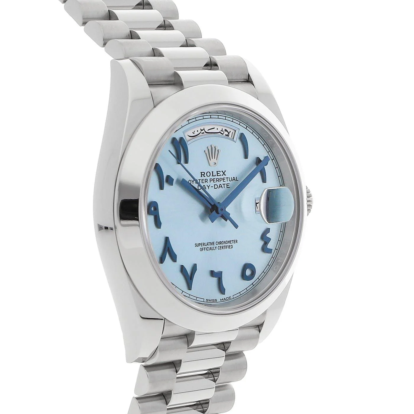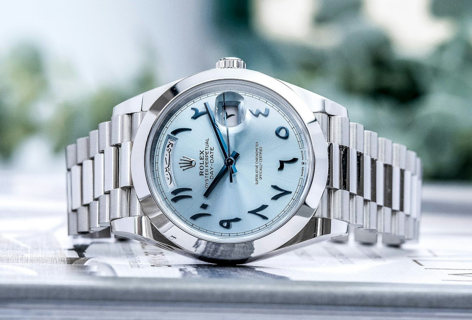 اكتشف ساعة رولكس عربي التي تجسد التميز والأناقة الساحرة في كل تفصيلة. هذه الساعة الرائعة تأتي بتصميم دائري كلاسيكي، مع علبة مصنوعة من المعدن الفاخر اللامع الذي يعكس الضوء ببريق ساحر، مما يجعلها تبدو كجوهرة متلألئة على معصمك. الإطار الناعم يحيط بقرص أزرق فاتح يشبه صفاء السماء في يوم صافٍ، مزين بأرقام عربية أنيقة ومميزة تضفي لمسة ثقافية فريدة، تجعل ساعة رولكس عربي خياراً مثالياً لمن يقدرون التراث العربي الممزوج بالفخامة العالمية.