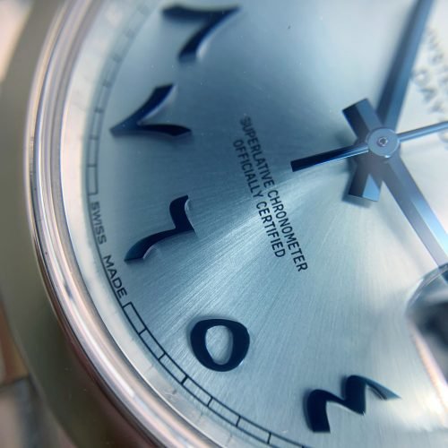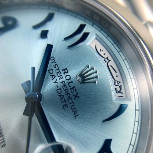 تتميز ساعة رولكس عربيه بسوار معدني متين ومريح، مصمم على شكل روابط مترابطة بسلاسة، يتناغم مع لون العلبة الفضي اللامع ليمنح إحساساً بالقوة والرقي في آن واحد. العقارب الزرقاء الرفيعة تشير بدقة إلى الوقت، بينما نافذة التاريخ واليوم تظهر بوضوح في أعلى القرص، مما يجعلها عملية وأنيقة للحياة اليومية. كل حركة في ساعه رولكس عربيه تبدو سلسة، مدعومة بآلية حركة سويسرية دقيقة تجعلها رفيقاً موثوقاً في كل لحظة.