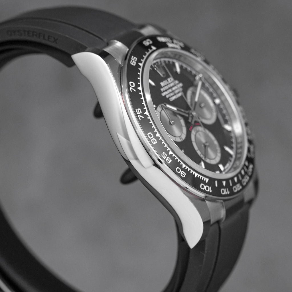 التدرج بين درجات الأسود والفضي على القرص يعكس توازناً بصرياً فريداً، فيما يبرز الإطار الخارجي بتدرجاته الرقمية باللون الأسود لمسة تنافسية محببة لعشاق الحماسة. أما العقارب والمؤشرات، فقد صممت بعناية لتوفير وضوح رائع في القراءة ولإضفاء لمسة لامعة تزيد من فخامة ساعة رولكس دايتونا ميرور أوريجنال.