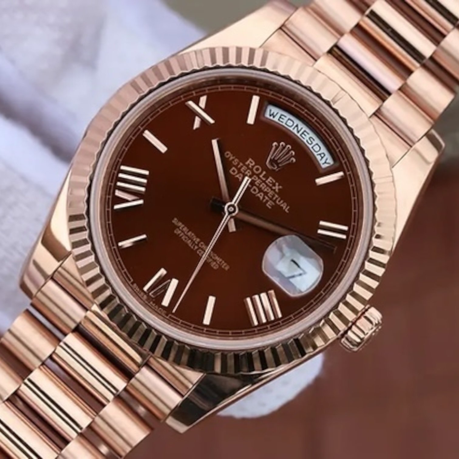 اكتشف أحدث ساعات رولكس داي ديت ميرور أوريجينال، تحفة فنية تجمع بين التراث السويسري الأصيل والابتكار الحديث، مصممة لتكون رفيقك اليومي في عالم الرفاهية. هذه الساعة الرائعة تتميز بإطارها المحزز اللامع من الذهب الوردي النقي، الذي يعكس أشعة الضوء ببريق ساحر يلفت الأنظار في كل لحظة. القرص البني الداكن، المستوحى من ألوان الشوكولاتة الغنية، يضفي لمسة من الدفء والأناقة، مع أرقام رومانية كبيرة ومميزة تبرز بوضوح تحت طبقة الكريستال السافير المقاوم للخدوش. في وسط هذا القرص الساحر، تظهر نافذة اليوم بالكامل باللغة الإنجليزية، مثل “MONDAY”، إلى جانب نافذة التاريخ المستديرة التي تعرض الرقم “28” بأسلوب كلاسيكي يعكس دقة رولكس الشهيرة.