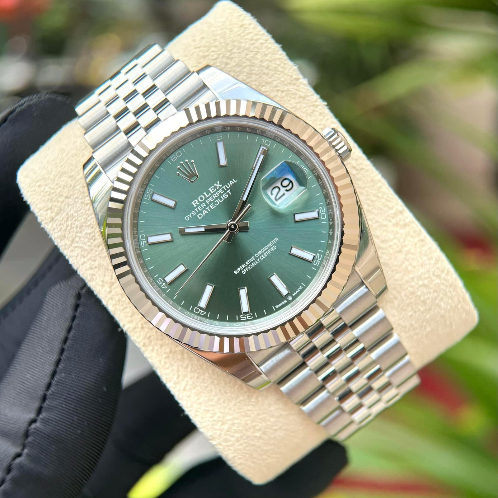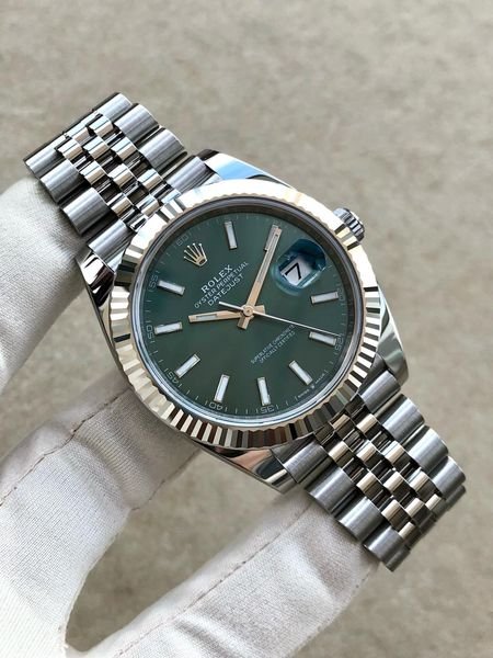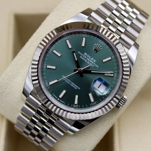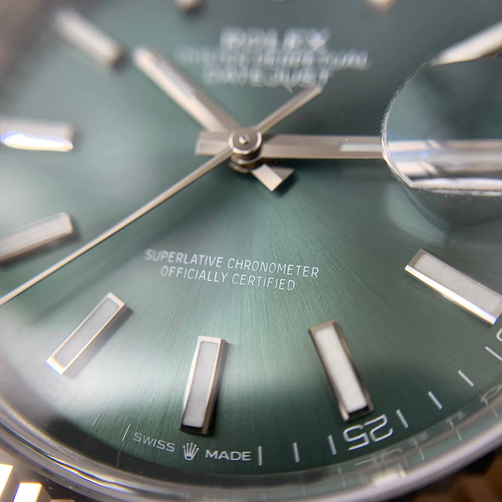 دعونا نغوص في تفاصيل شكلها الرائع. القرص الدائري الأخضر اللامع يبرز بشكل مذهل و فني تحت الزجاج الياقوتي المقاوم للخدوش، مع علامات ساعات فضية تتلألأ كالنجوم في سماء ليلية صافية. في المنتصف، يتربع شعار رولكس الشهير مع كتابة “Oyster Perpetual Datejust” بخطوط أنيقة، تضيف لمسة من التراث السويسري الأصيل. نافذة التاريخ عند موضع الساعة الثالثة تظهر اليوم بوضوح، محاطة بعدسة مكبرة تجعل القراءة سهلة وأنيقة في آن واحد. الإطار المحزز، المعروف بتصميمه الفلوتيد، يلمع ببريق معدني يجذب الأنظار، مصنوع من الفولاذ عالي الجودة الذي يضمن المتانة دون التخلي عن الجمال.