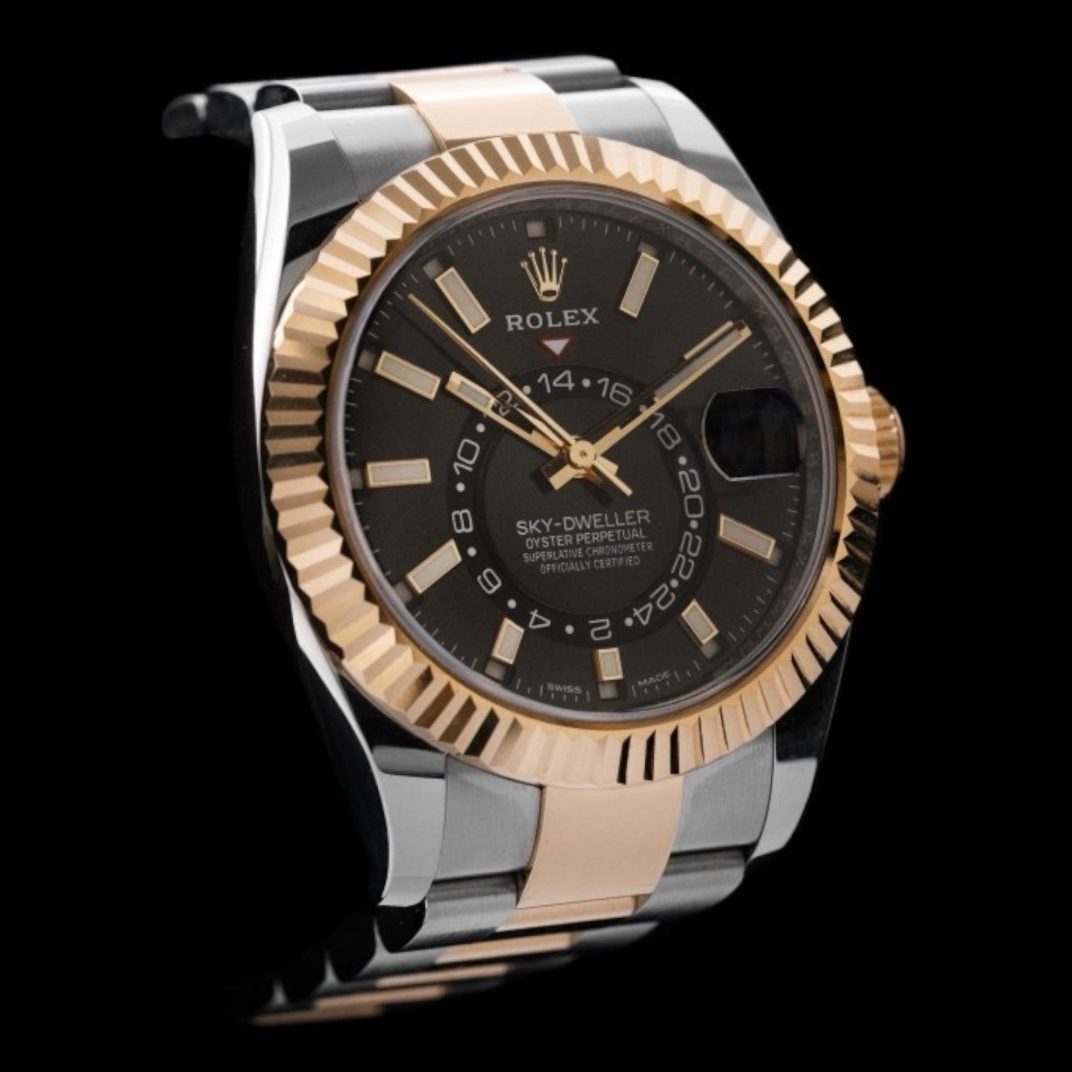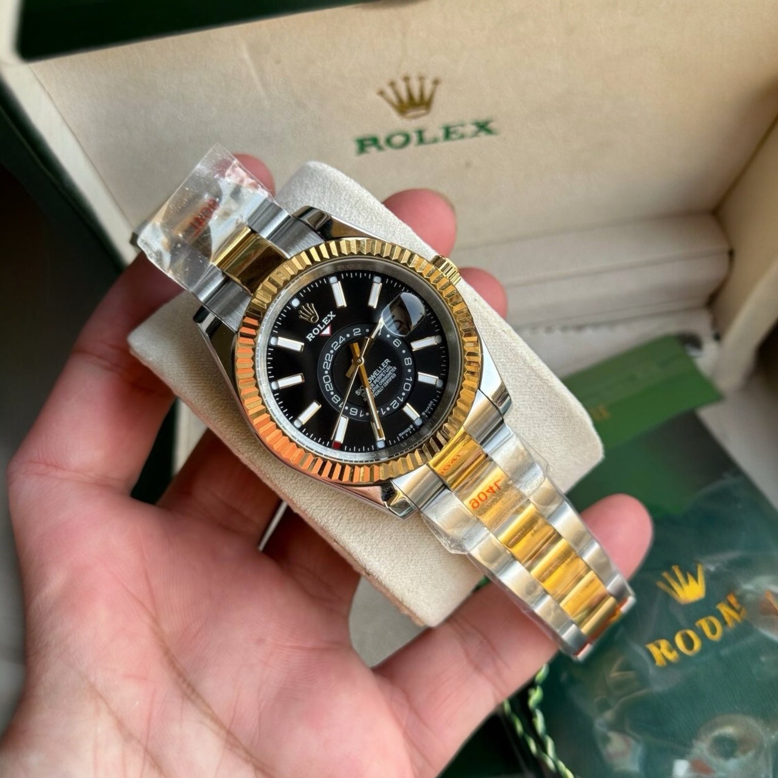 تتمتع الساعة بوجه أسود أنيق تزينه مؤشرات وعقارب ذهبية متوهجة، تمنحك وضوحاً مطلقاً وسهولة في قراءة الوقت مهما كانت ظروف الإضاءة. الحافة المسننة الدوارة تعكس براعة التصميم وتُضفي طابعاً ملكياً يوحي بالتفرد، بينما نافذة التاريخ عند مؤشر الساعة الثالثة تزداد وضوحاً بفضل الإطار المكبر، لتضيف بعداً عملياً وجمالياً في آنٍ واحد. تعكس ساعة رولكس سكاي دويللر ميرور اورجينال اهتمامك بأدق التفاصيل، حيث تجمع بين الأناقة والقوة في تناغم استثنائي.