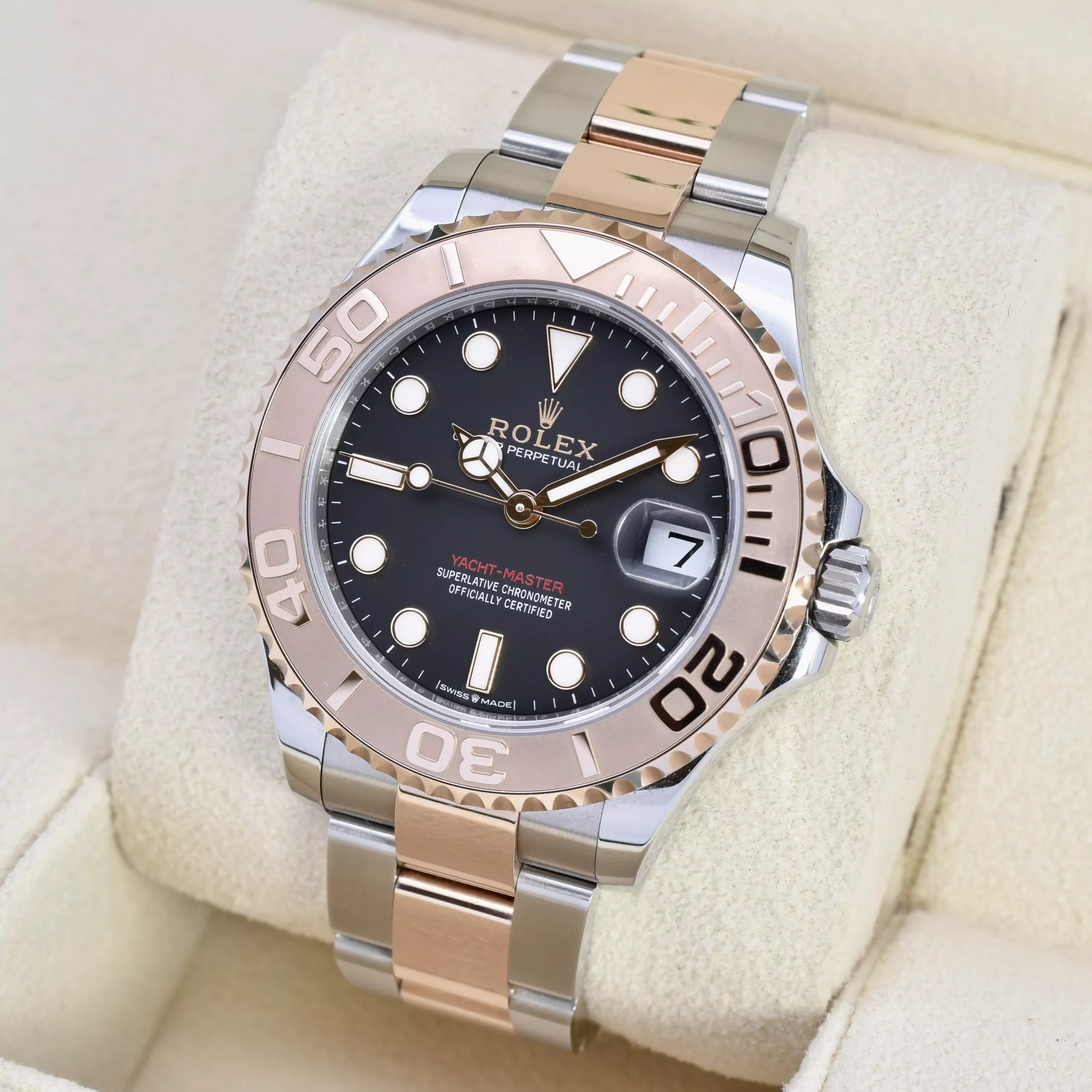 ساعة “يخت ماستر” تمتاز بتصميم استثنائي يمزج بين الأناقة والجرأة، لتخطف الأنظار على الفور وتمنح مرتديها فخامة متميزة. تتألق بإطارها الدوار ثنائي الاتجاه المصنوع بدقة ليضفي لمسة رياضية غاية في الجاذبية، بينما تنتقل العين بسلاسة نحو ميناء الساعة الأسود الراقي، الذي يزيد من بروز مؤشرات الساعات الدائرية واليدين العريضتين المطلية بمادة مضيئة لتوفير وضوح فائق حتى في الإضاءة المنخفضة. يعكس هذا الدمج ما بين المعدن الوردي البراق والفولاذ الصقيل شخصية الساعة العصرية والمتألقة، مما يجعلها الرفيق الأمثل لكل مناسبة، سواء رسمية أو كاجوال.
