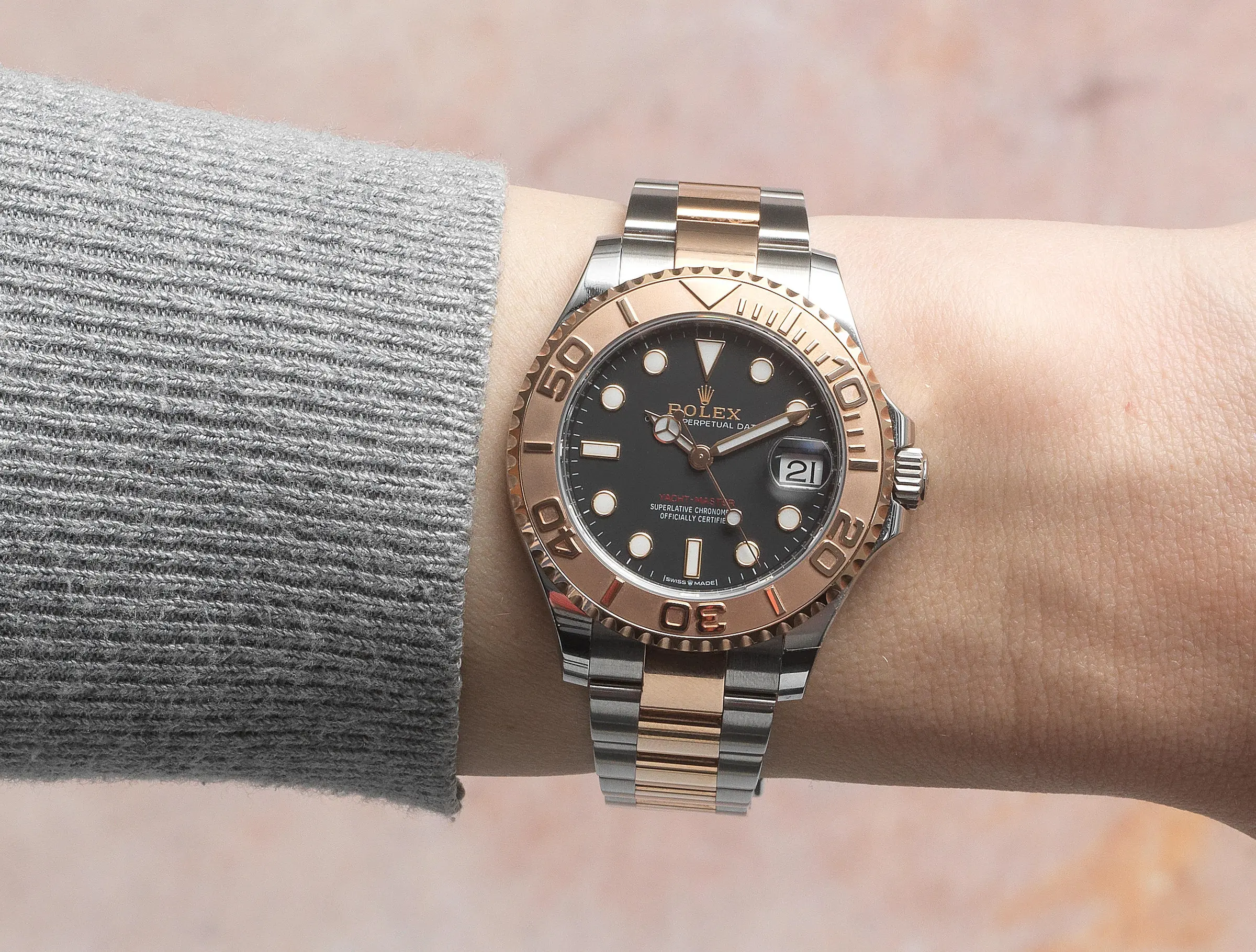ساعة “يخت ماستر” تمتاز بتصميم استثنائي يمزج بين الأناقة والجرأة، لتخطف الأنظار على الفور وتمنح مرتديها فخامة متميزة. تتألق بإطارها الدوار ثنائي الاتجاه المصنوع بدقة ليضفي لمسة رياضية غاية في الجاذبية، بينما تنتقل العين بسلاسة نحو ميناء الساعة الأسود الراقي، الذي يزيد من بروز مؤشرات الساعات الدائرية واليدين العريضتين المطلية بمادة مضيئة لتوفير وضوح فائق حتى في الإضاءة المنخفضة. يعكس هذا الدمج ما بين المعدن الوردي البراق والفولاذ الصقيل شخصية الساعة العصرية والمتألقة، مما يجعلها الرفيق الأمثل لكل مناسبة، سواء رسمية أو كاجوال.