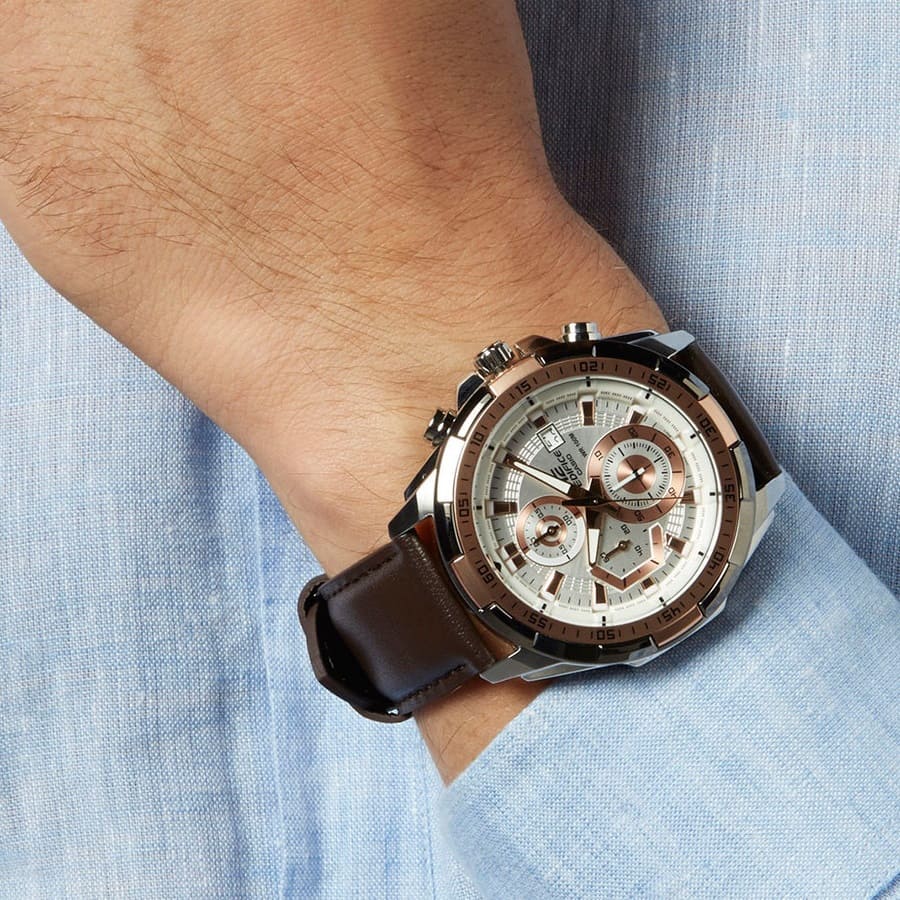 ما يزيد من جاذبية ساعة كاسيو اديفيس رجالي EFR-539L-7AV هو الإطار المعدني المصقول الذي يحاكي الساعات الفاخرة، مع زراري التحكم الجانبيين لإضفاء إحساس رياضي عملي واستخدام مريح. أما السوار المصنوع من الجلد الطبيعي باللون البني الغامق فيعكس الفخامة والرقي، كما يمنحك إحساسًا بالراحة حتى مع ارتدائها لفترات طويلة.