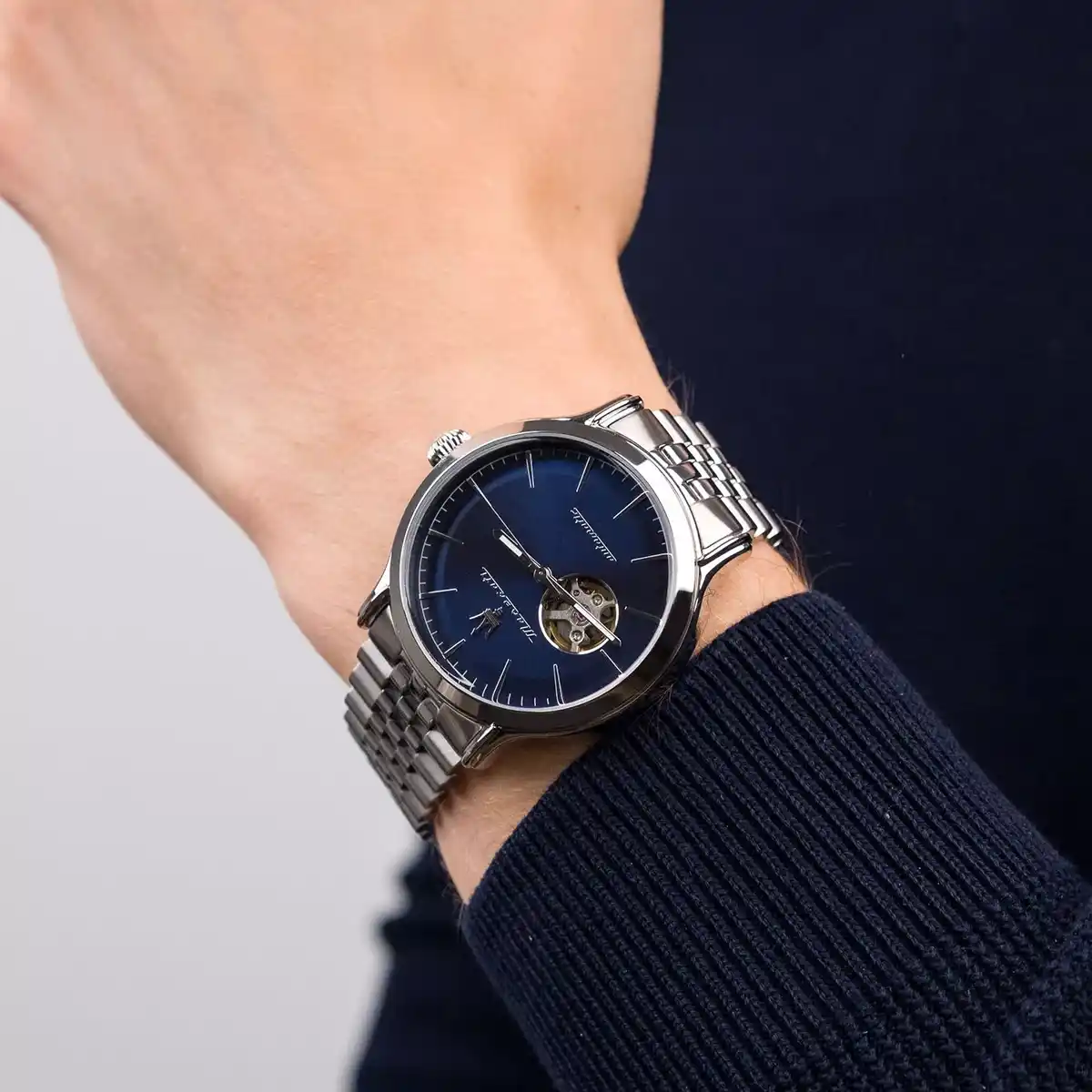 تخطف هذه التحفة الأنظار منذ الوهلة الأولى بواجهة زرقاء عميقة تتدرج بلمعة شمسية راقية، تتوسطها فتحة ميكانيكية تكشف نبض الحركة لتؤكد أن الجمال هنا ليس مظهراً فقط بل هندسة حقيقية. الميناء نظيف بخطوط نحيلة تعكس الدقة، وعقارب مصقولة تتوهج تحت الضوء لتمنح قراءة واضحة وأناقة لا تُقاوم. شعار الرمح الثلاثي يتصدر المشهد بثقة، في إشارة مباشرة إلى إرث السرعة والفخامة. إنها ساعة مازيراتي للرجال كما يجب أن تكون: مظهر مهيب وروح ميكانيكية أصيلة.