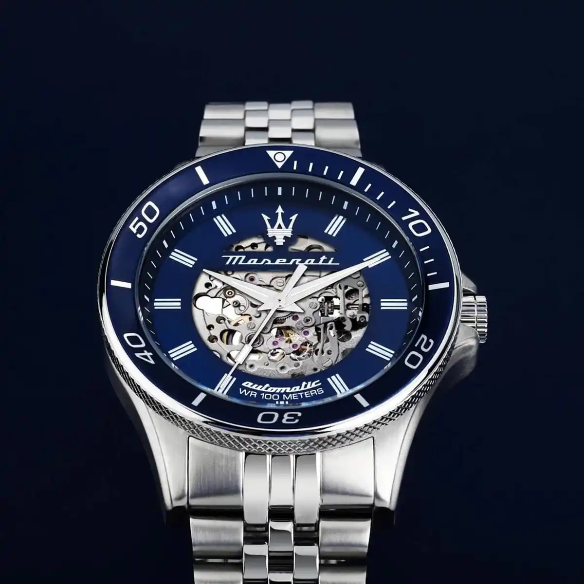 ارتقِ بذوقك إلى مستوى جديد مع ساعة مازيراتي للرجال التي تمزج بين روح الأداء الإيطالي وفلسفة التصميم الراقي. هذه التحفة تقدم مظهراً ذكورياً متجانساً مع تفاصيل دقيقة تعكس الفخامة من أول نظرة: إطار أزرق لامع بتدرجات أنيقة يحيط بمينا هيكلي يكشف آلية الحركة الأوتوماتيكية، لتشاهد نبض الدقة في كل ثانية. المؤشرات الرومانية الرفيعة وعقارب السيف المصقولة تضيفان وضوحاً مريحاً وملمساً بصرياً مترفاً، بينما يبرز شعار الرمح الثلاثي كختم أصالة وقوة.