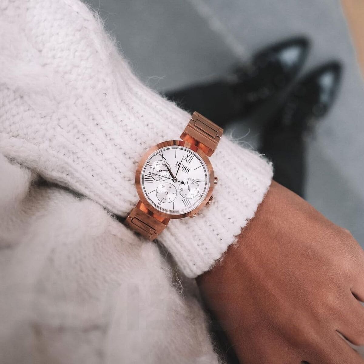 ساعة هوجو بوس للنساء أصلية موديل (كلاسيك سبورت) Classic Sport 1502399 بلون فضي و استيك معدن بلون نحاسي