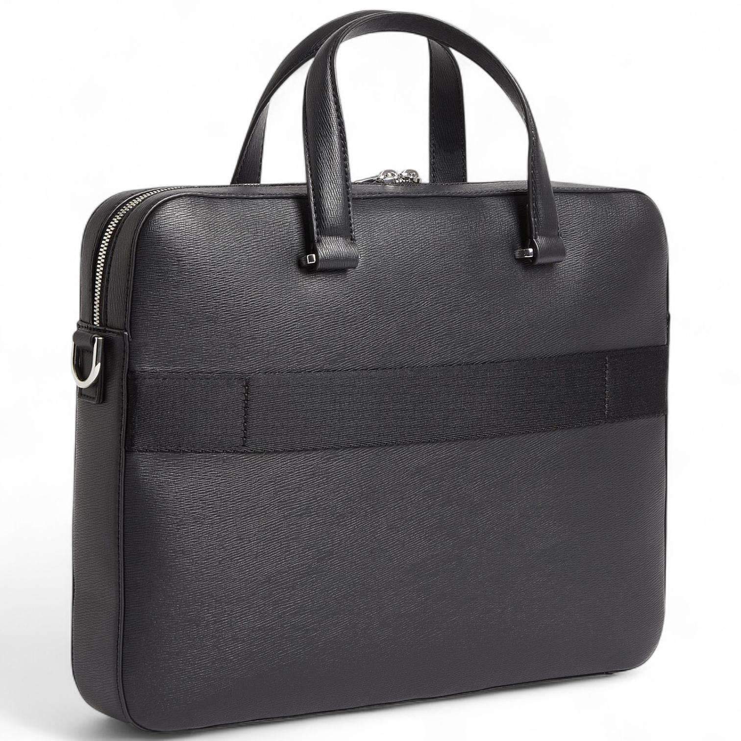تفتح السحّابة المعدنية القوية بانزلاق سلس لتكشف عن حجرة داخلية مبطّنة بعناية، تحفظ جهاز اللابتوب والملفات والأوراق المهمة بأمان. في الداخل جيوب منظمة لأقلامك ومحفظتك وهاتفك، لتجد كل شيء في مكانه لحظة احتياجه. أما الظهر فيأتي بحزام تمرير عريض يثبّت الحقيبة على مقبض حقيبة السفر، لتتحول رحلات العمل إلى تجربة أكثر خفة وسلاسة. الحواف المدورة تمنح التصميم طابعاً متوازناً بين الصرامة والفخامة، وتضيف حماية عملية من الصدمات اليومية.