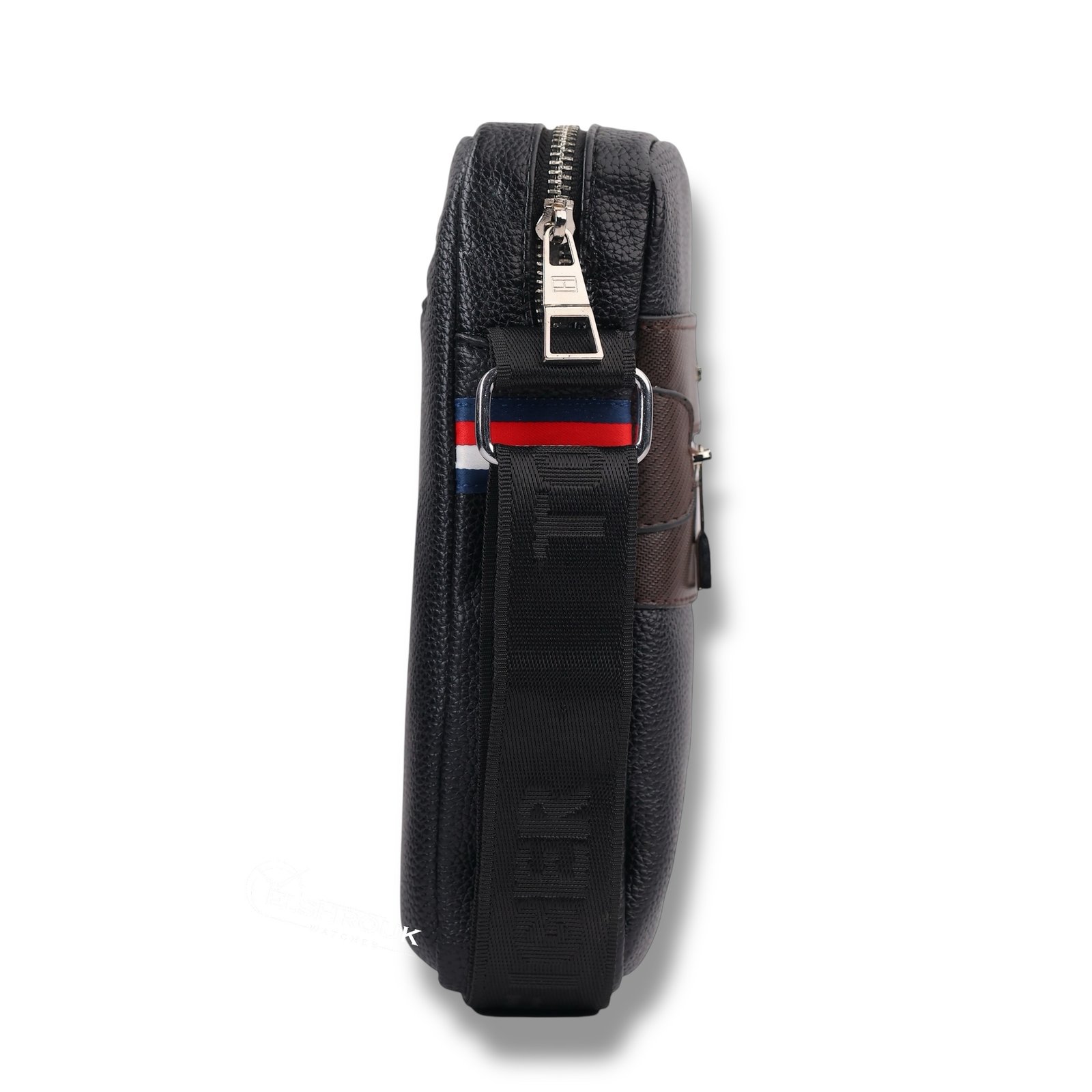 حزام الكتف قابل للتعديل وعريض بما يكفي لتوزيع الوزن براحة على الكتف، كما يحمل شعار العلامة بحياكة ناعمة تمنح مظهراً رياضياً أنيقاً. مشابك معدنية بلون فضي مصقول تضيف إحساساً بالفخامة وتعمل بسلاسة عند التدوير أو الفك، فيما يمنح اللون الأسود العميق قابلية تنسيق عالية مع أزياء الكاجوال والسمارت كاجوال على حد سواء.