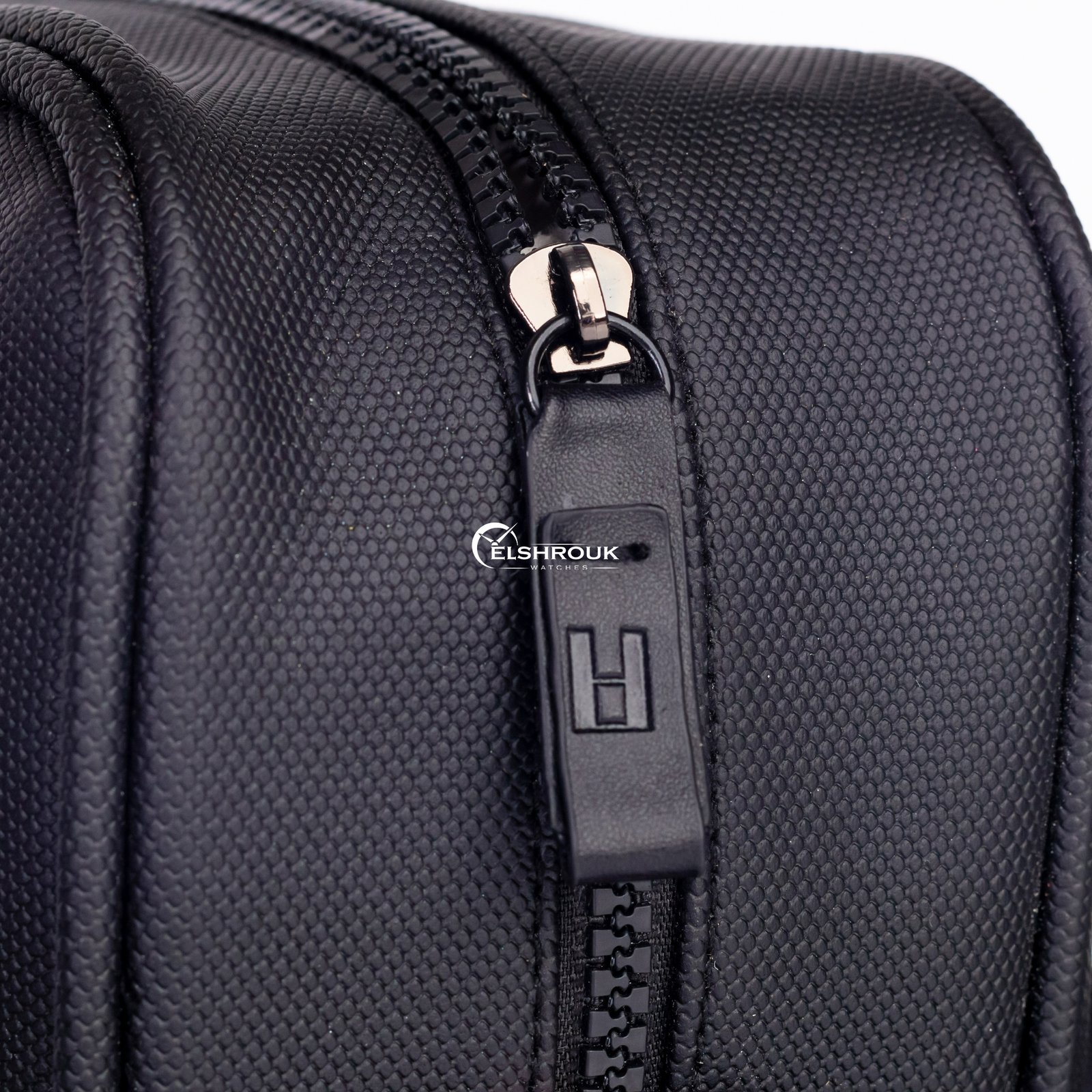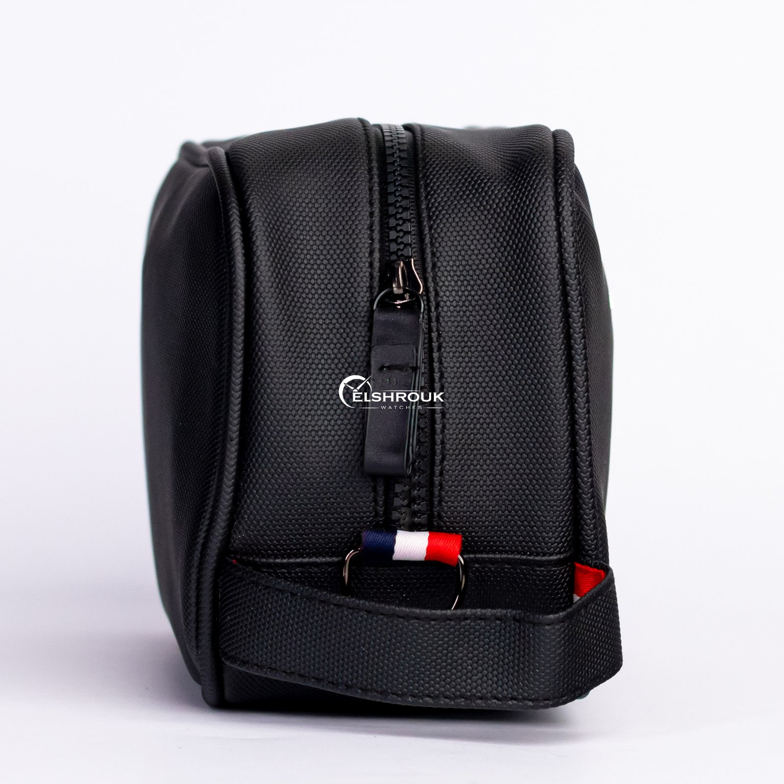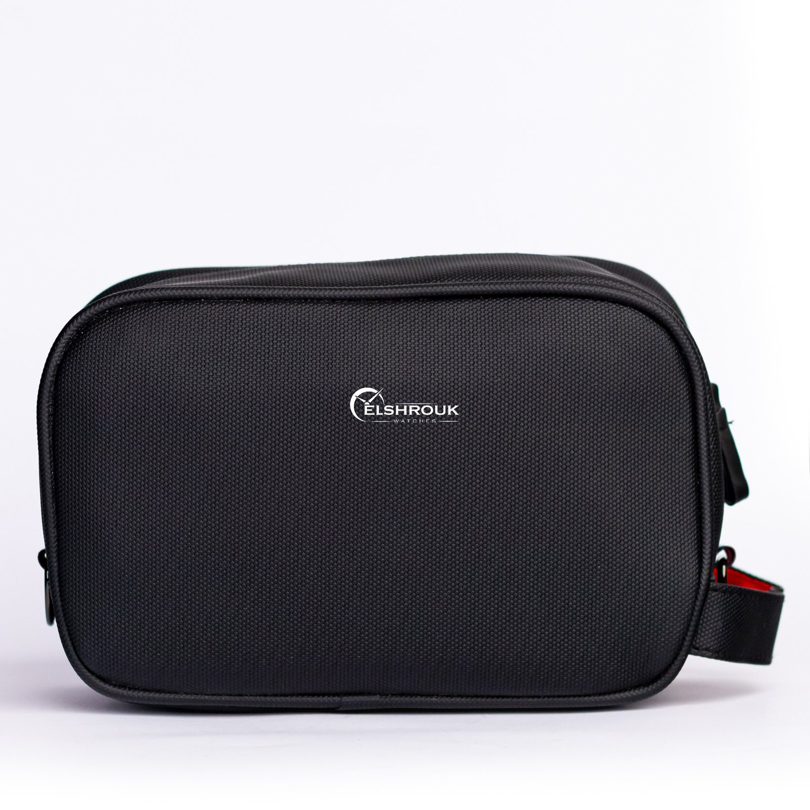 تأتي الواجهة الأمامية بانسيابية جذابة تتوسطها لمسة شعار معدني مصقول، بينما يحيط بالإطار تنعيم دقيق وخياطات محكمة تزيد من صلابتها. خامتها الخارجية متينة بملمس محبّب مقاوم للخدش ولبقع الاستخدام اليومي، مع سحاب علوي ناعم الانزلاق يفتح ويغلق بسلاسة ويوفر وصولاً سريعاً للمحتويات. الشكل المستطيل بحواف مستديرة يمنحها مظهراً متوازنًا يسهل حمله داخل أي حقيبة سفر أو استخدامه منفرداً.