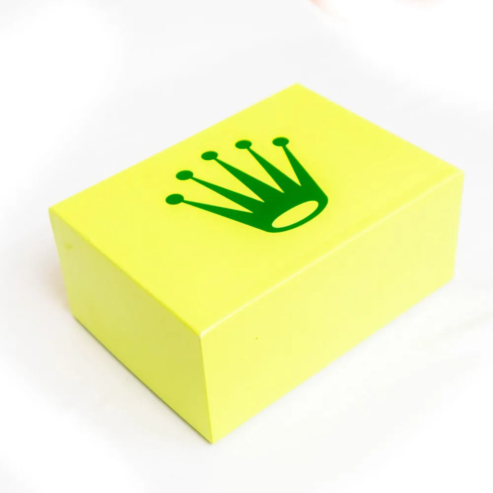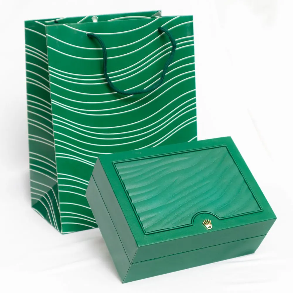 في الداخل ستجد التصميم الأخضر المموج بلمسة التاج الذهبية على القفل، وهو توقيع بصري يميز بوكس ساعة رولكس ويجعل الصور والإعلانات أكثر احترافية ليقع النظر فورًا على موجات السطح البارزة.