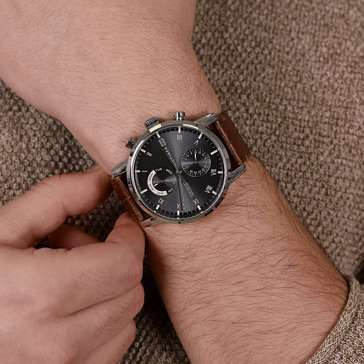 بلون رمادي و استيك جلد طبيعي بلون بني