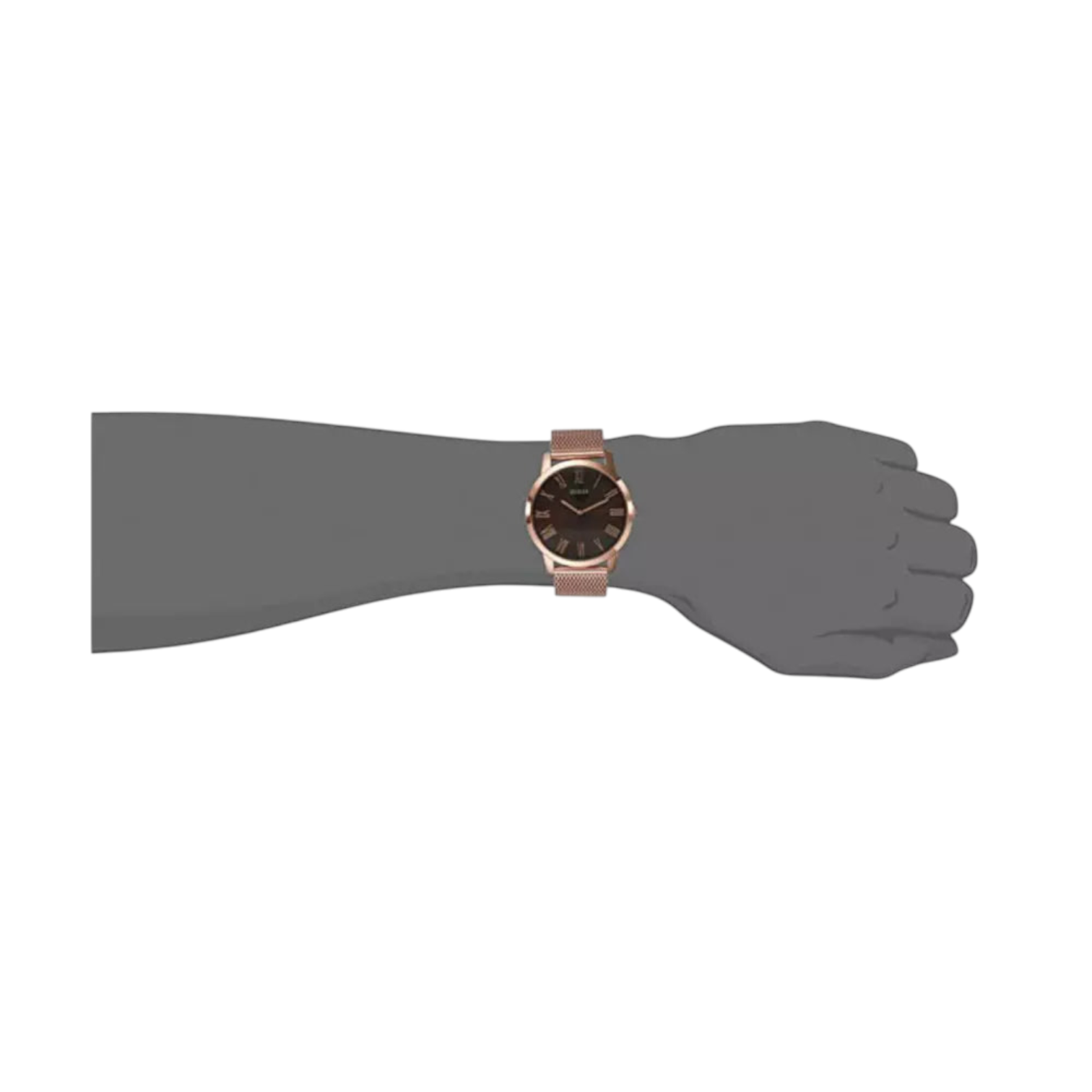 تمنحك ساعة Guess الرجالية هذه حضورًا دافئًا وفاخرًا بفضل لونها النحاسي المائل للذهبي الوردي، لتبدو كقطعة إكسسوار راقية أكثر من كونها مجرد أداة لقراءة الوقت. الميناء البني المتدرج يلمع بتأثير أشعة الشمس، وتحيط به أرقام رومانية رفيعة تعزز الطابع الكلاسيكي، مع عقارب نحيفة بنفس اللون تضيف لمسة من البساطة الأنيقة.