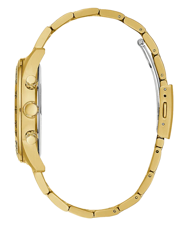 هذه القطعة ليست مجرد إكسسوار؛ إنها بيان أسلوب. كل تفصيل فيها صُمّم ليحكي قصة نجاح: أزرار جانبية مصقولة تُبرز تقنية الكرونوغراف، وزجاج قوي يكسر الوهج ليحافظ على وضوح القراءة في مختلف الإضاءات. السوار يُغلق بمشبك آمن منسجم مع الخطوط العامة، ما يمنح راحة وثباتاً خلال الاستخدام اليومي والمناسبات الخاصة. اللون الذهبي الموحد يمنح الساعة حضوراً طاغياً على المعصم، فيجعلها قطعة محورية تُكمل البدلة الرسمية بامتياز وتمنح إطلالة السهرة توقيعاً لامعاً.