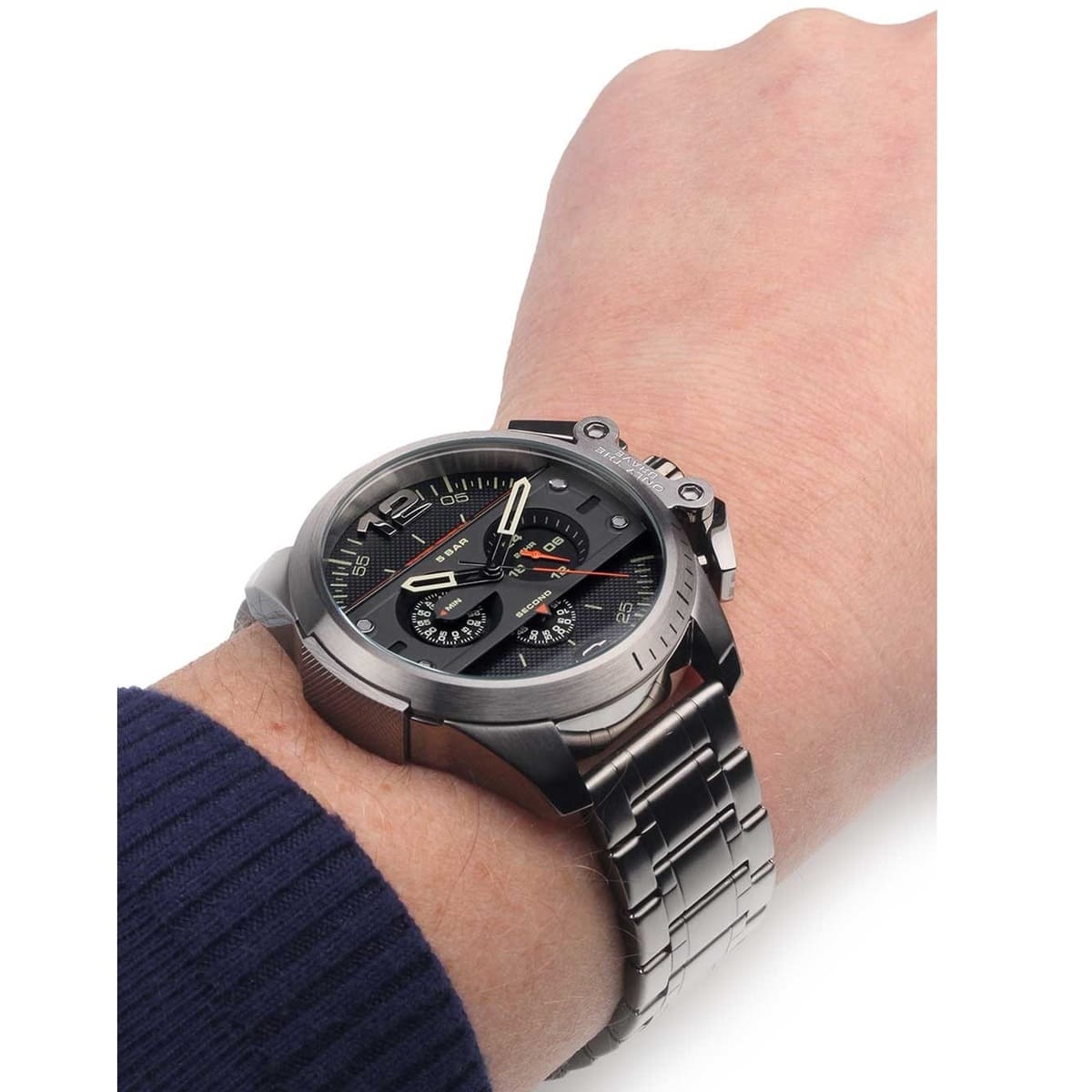ساعة ديزل من عائلة موديلات ايرونسايد DZ4363 ساعات ديزل مثلاً، من أرقى ما يمكن أن تتصوّره العين، ساعات لا توصف لا من الداخل ولا حتى من الخارج، هي باختصار تحفاً فنية لا أقلّ ولا أكثر مينا رمادى و أستيك لون رمادي بشكل مميز عن ما قبل من الموديلات و تاخذ القطعه شكل دائري باطار وجسم من الستانلس ستيل المعالج حرارياً المقاوم للصدأ ليحظي بتجربة وديمومة رائعه فى الاستخدام بشكل يومي رائع وفعال