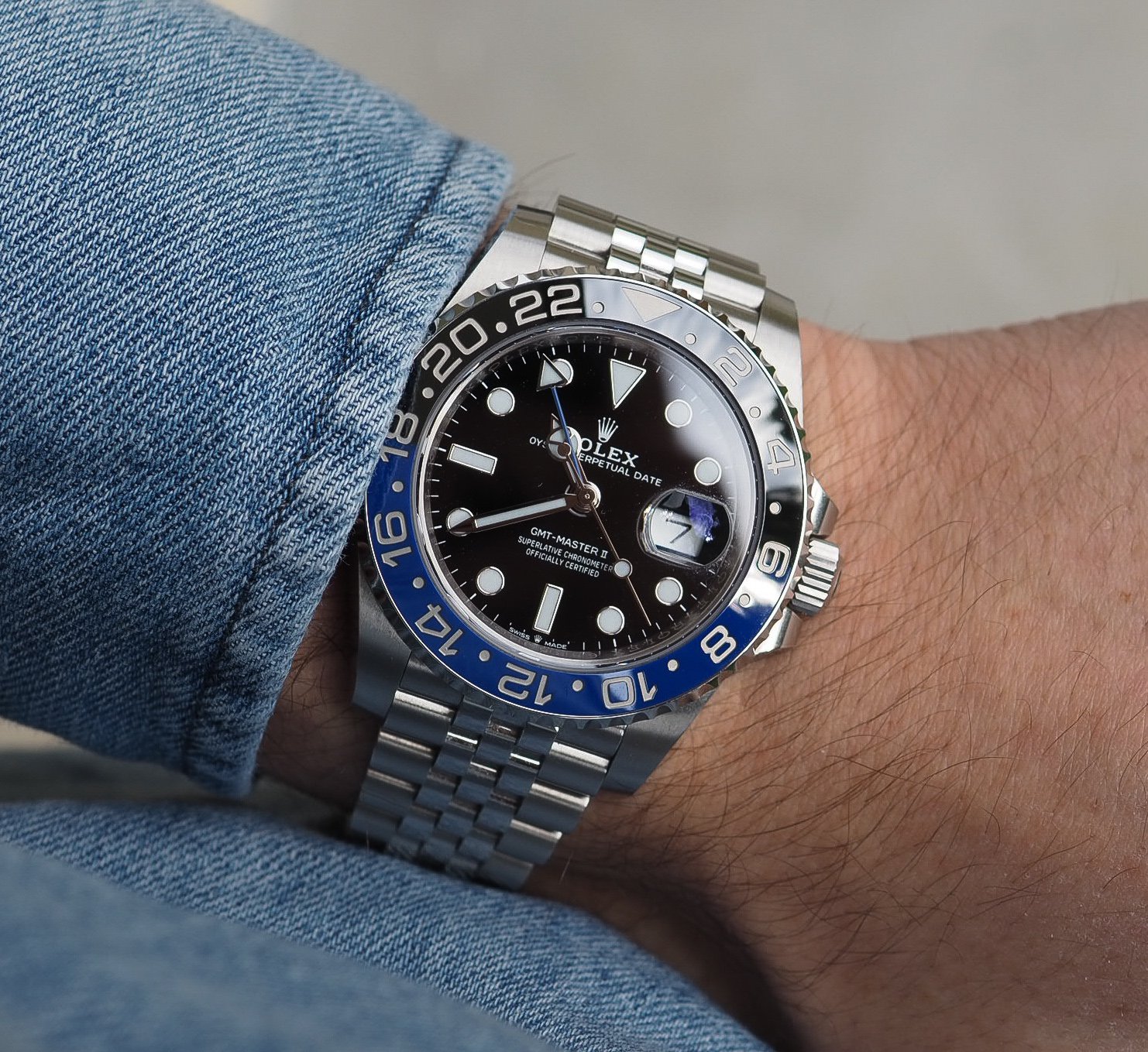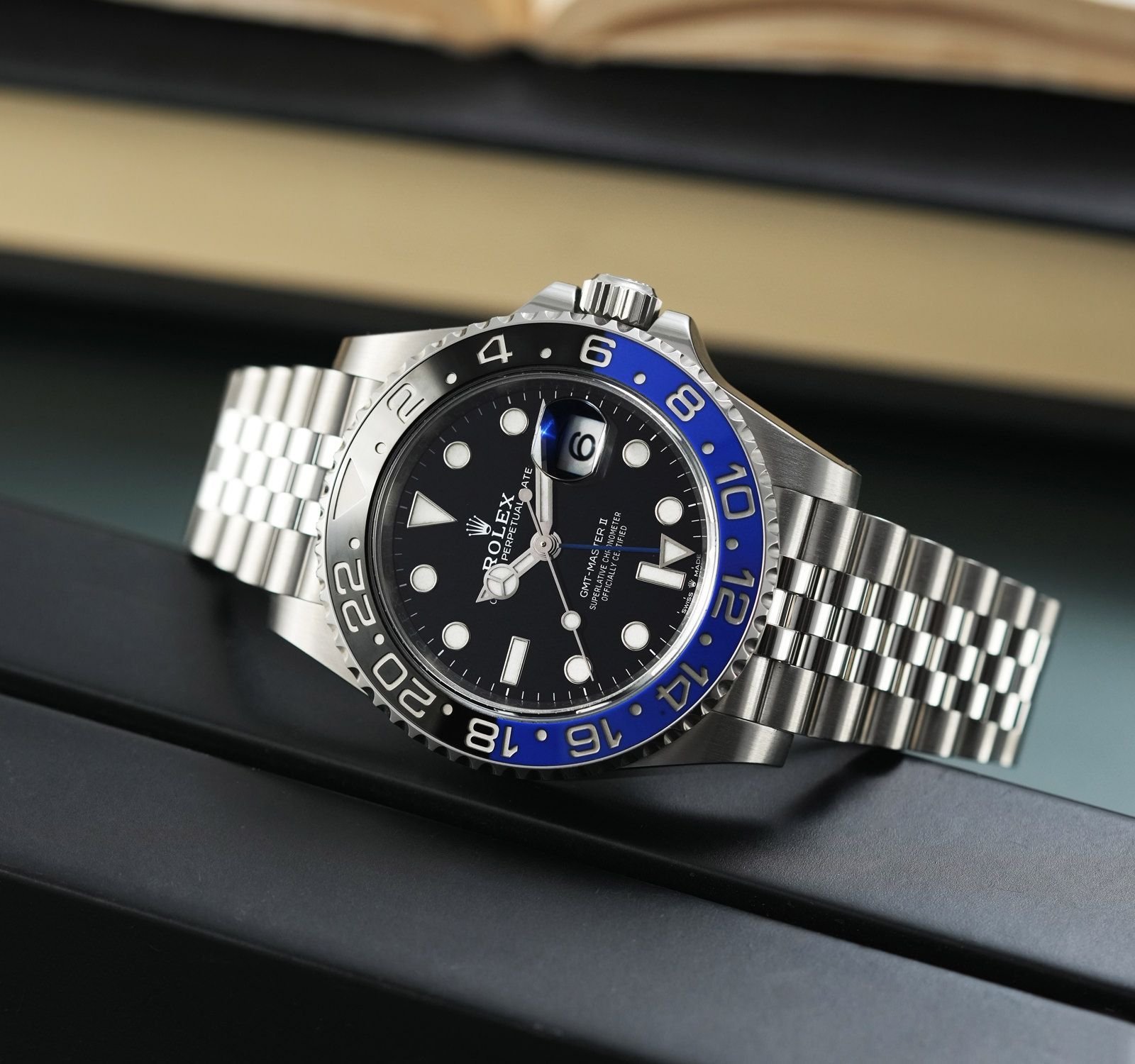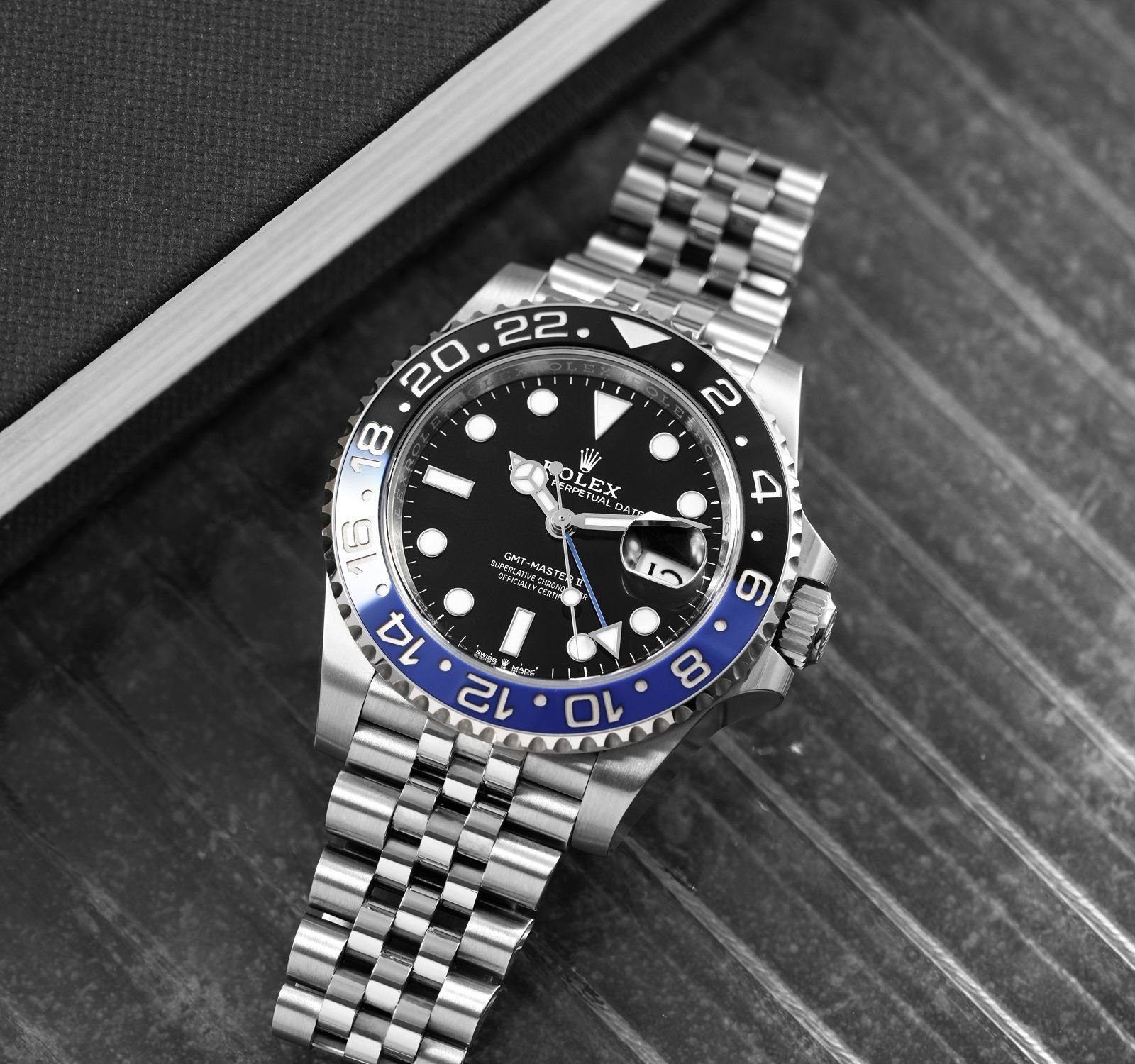 ساعة رولكس جوبلي  GMT-Master II الأنيقة الواعدة تُعد واحدة من أفخم الساعات الرجالية التي تجمع بين الروعة الهندسية والتصميم المبتكر. تمثل هذه الساعة الفاخرة قمة الأناقة بفضل تجمعها بين الإطار الدوّار ثنائي اللون (أسود وأزرق) والذي يشعرك بالفخامة والتميز، مع سوار جوبيل المصنوع من الفولاذ المقاوم للصدأ، الذي يضفي عليها لمسة حرفية متقنة وشعوراً رائعاً بالراحة على المعصم. يبرز القرص الأسود الكلاسيكي مع مؤشرات الوقت الكبيرة المضيئة، ليسمح لك بقراءة الوقت بدقة وسهولة حتى في ظروف الإضاءة المنخفضة، وهو أمر مثالي للرجل النشيط وعاشق الترحال.