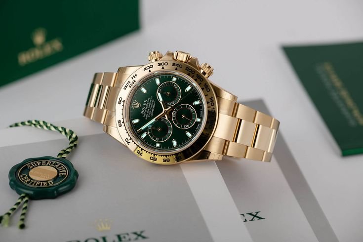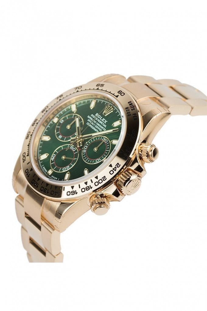 تأتي ساعة رولكس ذهبية موديل دايتونا ميرور أوريجنال مميزة بسوار مطلي باللون الذهبي، وبإطار يعكس بريق الذهب مع جودة عالية في التشطيب تحاكي التصميم الأصلي بشكل مذهل. الميناء الأخضر الجذاب يضفي للساعة طابعًا خاصًا، مع ثلاثة عدادات فرعية تضيف لمسة رياضية عملية. تفاصيل العقارب والمؤشرات واضحة وانسيابية، وأرقام التاكيمتر المحفورة حول الإطار تمنحها طابعًا ديناميكيًا مستوحى من روح السباق.