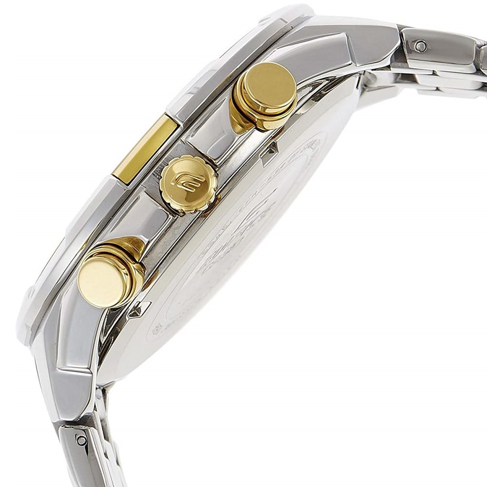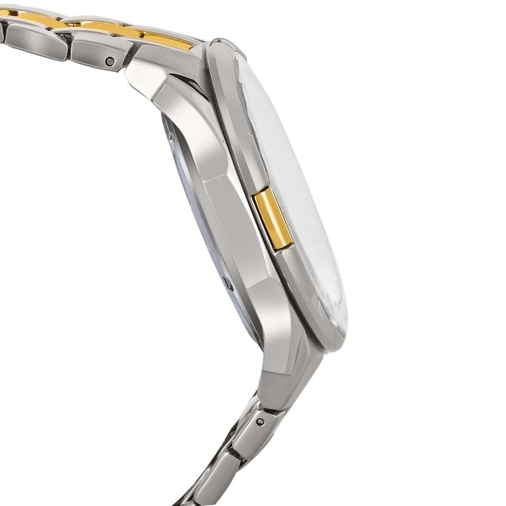 تتوسط الساعة علبة دائرية أنيقة تتميز بإطار ذهبي يمنحها لمعاناً أخاذاً ويعكس الضوء بطريقة تبرز فخامة التصميم. تعرض هذه القطعة الوقت بوضوح استثنائي، حيث تتوزع العقارب والمؤشرات بشكل هندسي جذاب يجمع بين الكلاسيكية والحداثة، وتظهر جميع الوظائف الداخلية بلمسات دقيقة تضيف إلى جاذبيتها. تفاصيل العدادات الصغيرة تمنح المستخدم تجربة ترقب دقيقة لأكثر من توقيت، إضافة إلى نافذة لعرض التاريخ بتصميم عصري ومريح للرؤية السريعة أثناء الانشغال.
