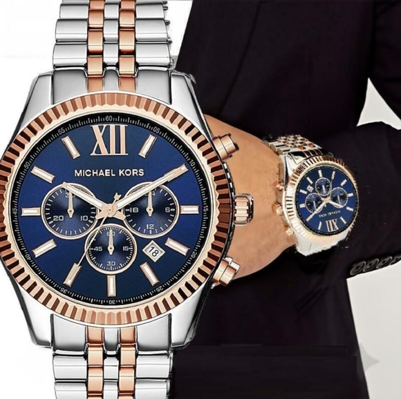 ساعة مايكل كورس للرجال اصلية موديلMK8412 بلون ازرق واستيك معدن بلون فضي و نحاسي