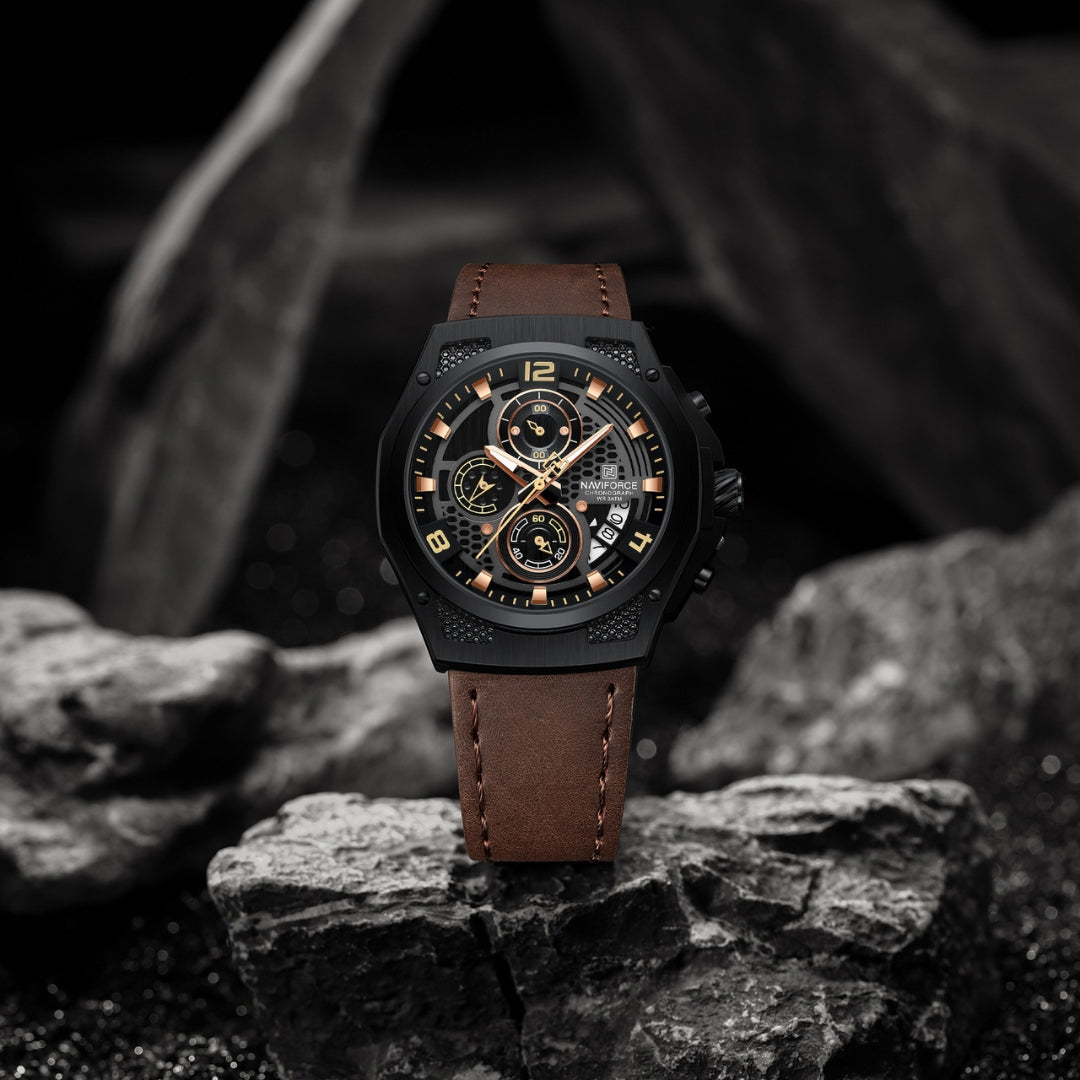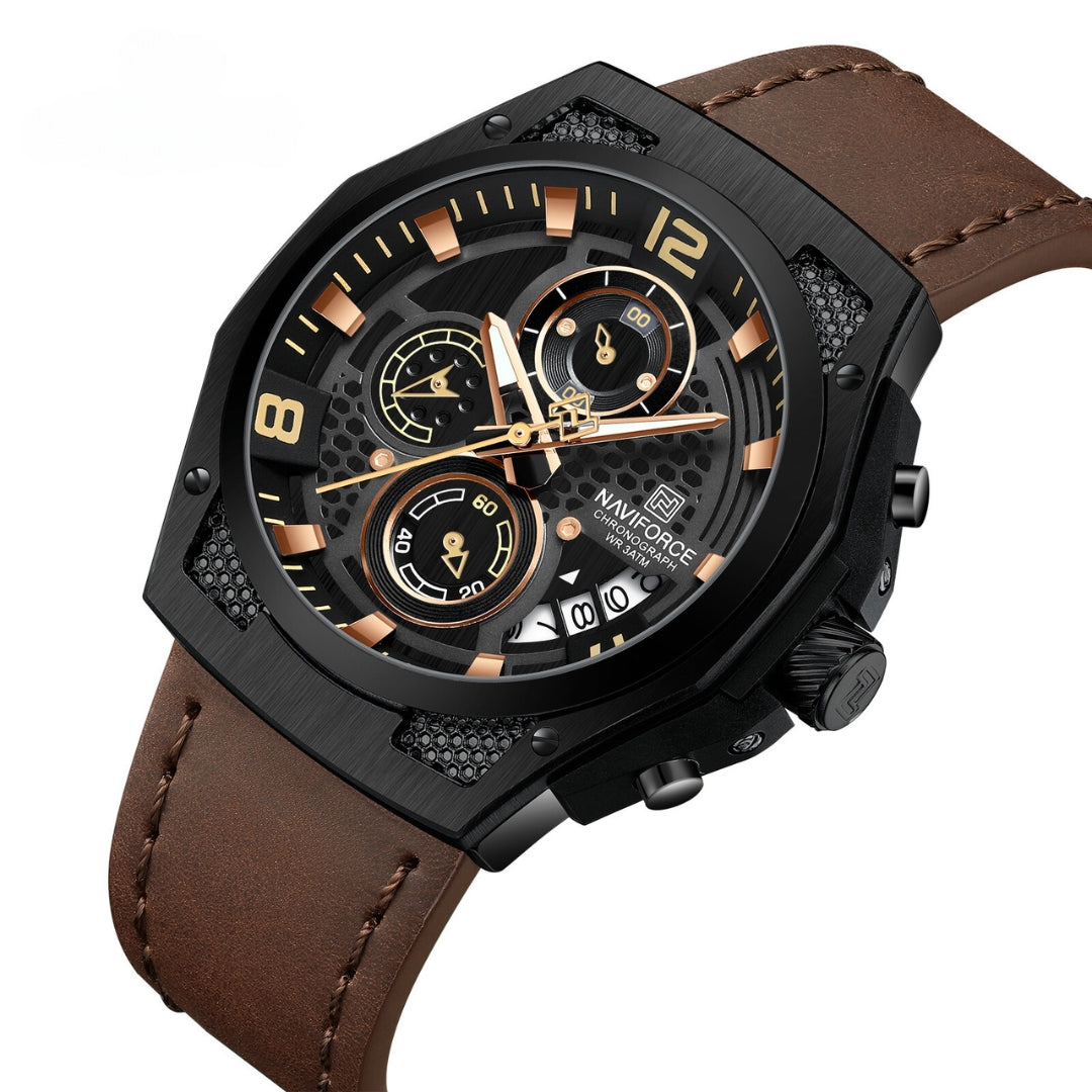 ساعة رجالي نافي فورس Naviforce NF8051L-B-Y/BN موديل ( NF8051L) بلون اسود و استيك جلد بلون بني يوجد شحن لجميع محافظات مصر