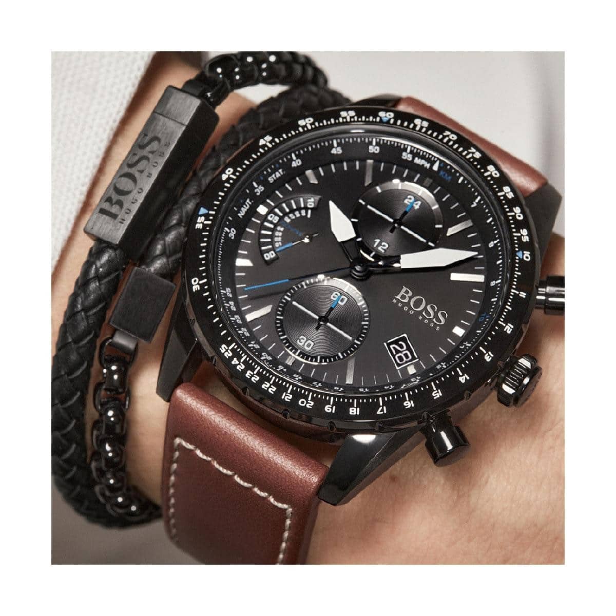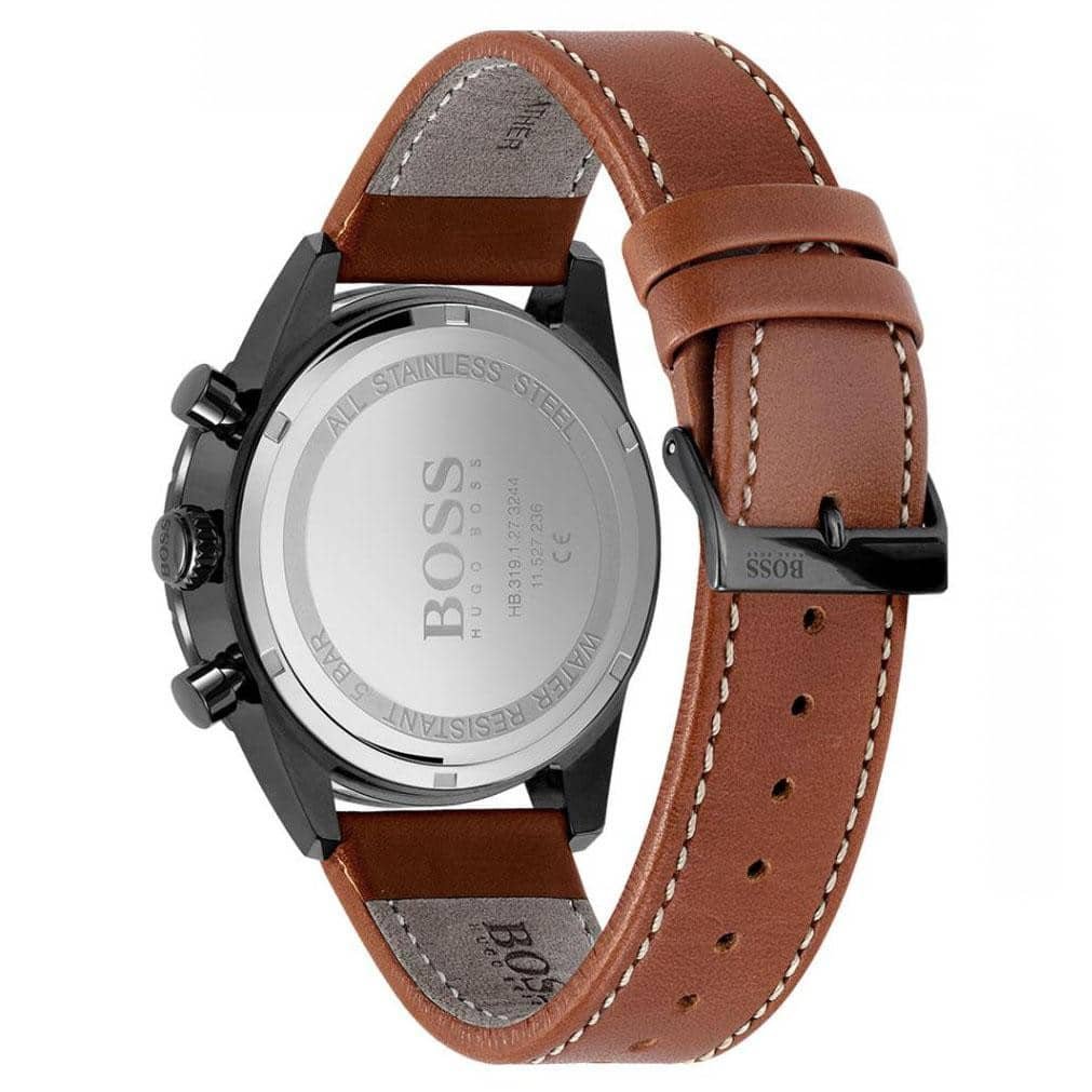 ساعة هوجو بوس للرجال أصلية موديل (بولت اديشن) Pilot Edition 1513851 بلون اسود و استيك جلد بلون بني