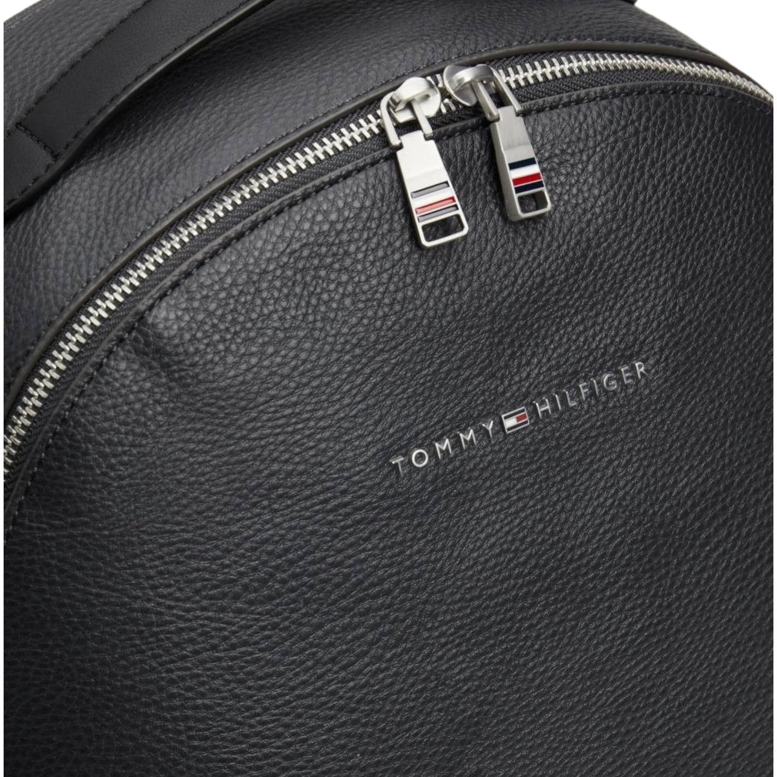شنطة ظهر شبابي من تومي بتصميم أنيق ولون أسود فاخر، سحاب مزدوج وشعار معدني، جيوب داخلية منظمة وأحزمة مبطنة لراحة يومية وأناقة عملية.