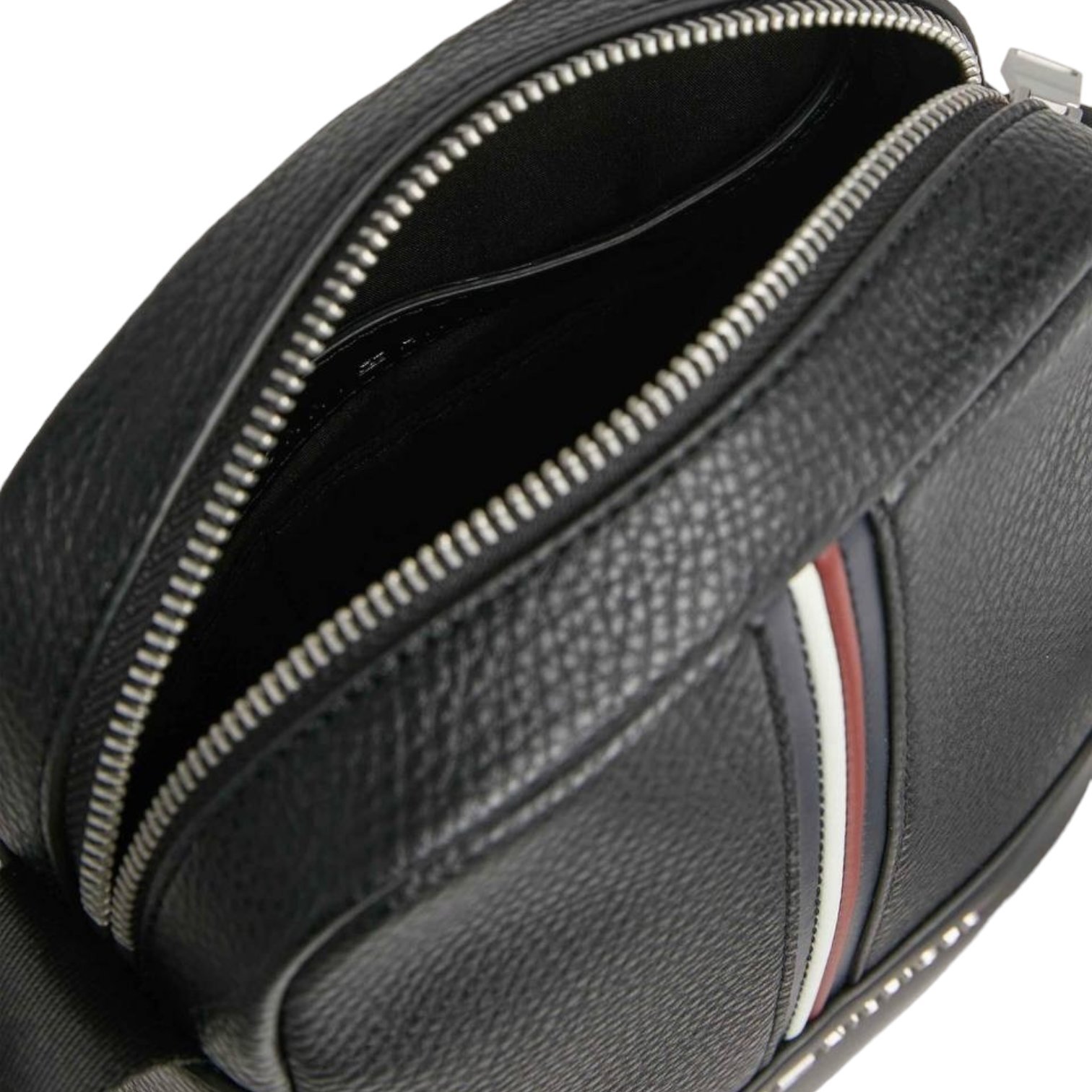 شنطة كروس تومي أنيقة بجلد محبب وشريط ألوان مميز، سحاب معدني سلس، حزام قابل للتعديل، جيوب داخلية وخارجية، حجم عملي يحفظ الأساسيات بأناقة يومية.