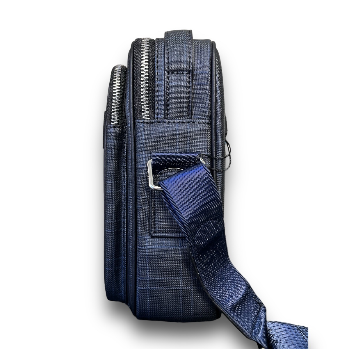 شنطة كروس لاكوست رجالي ازرق بتصميم مربعات أنيق، حزام قابل للتعديل، سحّابات معدنية متعددة الجيوب لتنظيم مثالي، متينة وخفيفة تناسب العمل والمشاوير اليومية