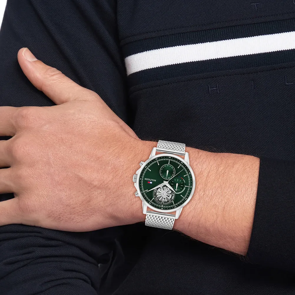 يتميز موديل تومي هيلفيغر ستيوارت بعرض نظري يجمع بين الأناقة والوظائف المتعددة، حيث يحتوي على عدادات فرعية تُظهر أيام الشهر والأسبوع بأسلوب مبتكر. التصميم المفتوح في الجزء العلوي يكشف عن الحركة الداخلية للساعة، مما يضيف لمسة فنية تجذب عشاق ساعات تومي هيلفيغر الذين يبحثون عن التميز في كل التفاصيل.