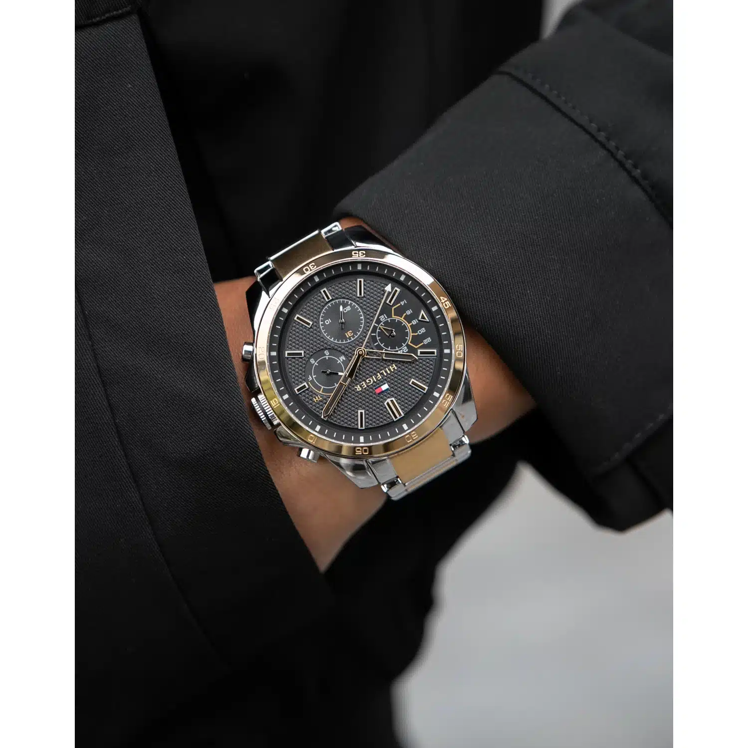 ساعة تومي هيلفيغر للرجال اصلية موديل (ديكر) Decker 1791559 بلون اسود واستيك معدن لون فضي وذهبي