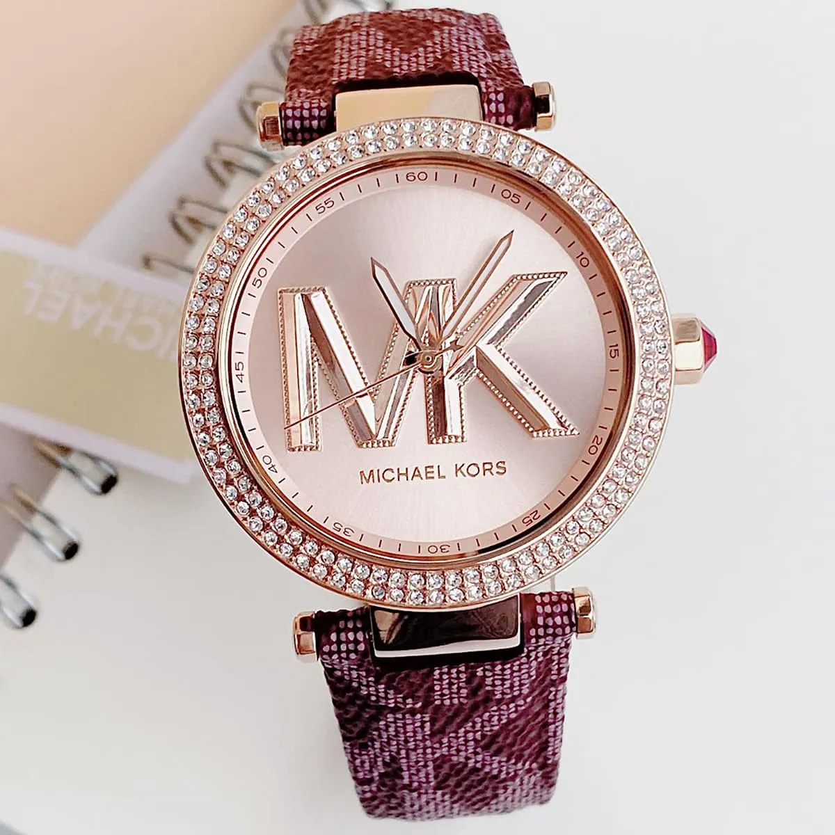 الساعة مزينة بفصوص كريستال و شعار MK