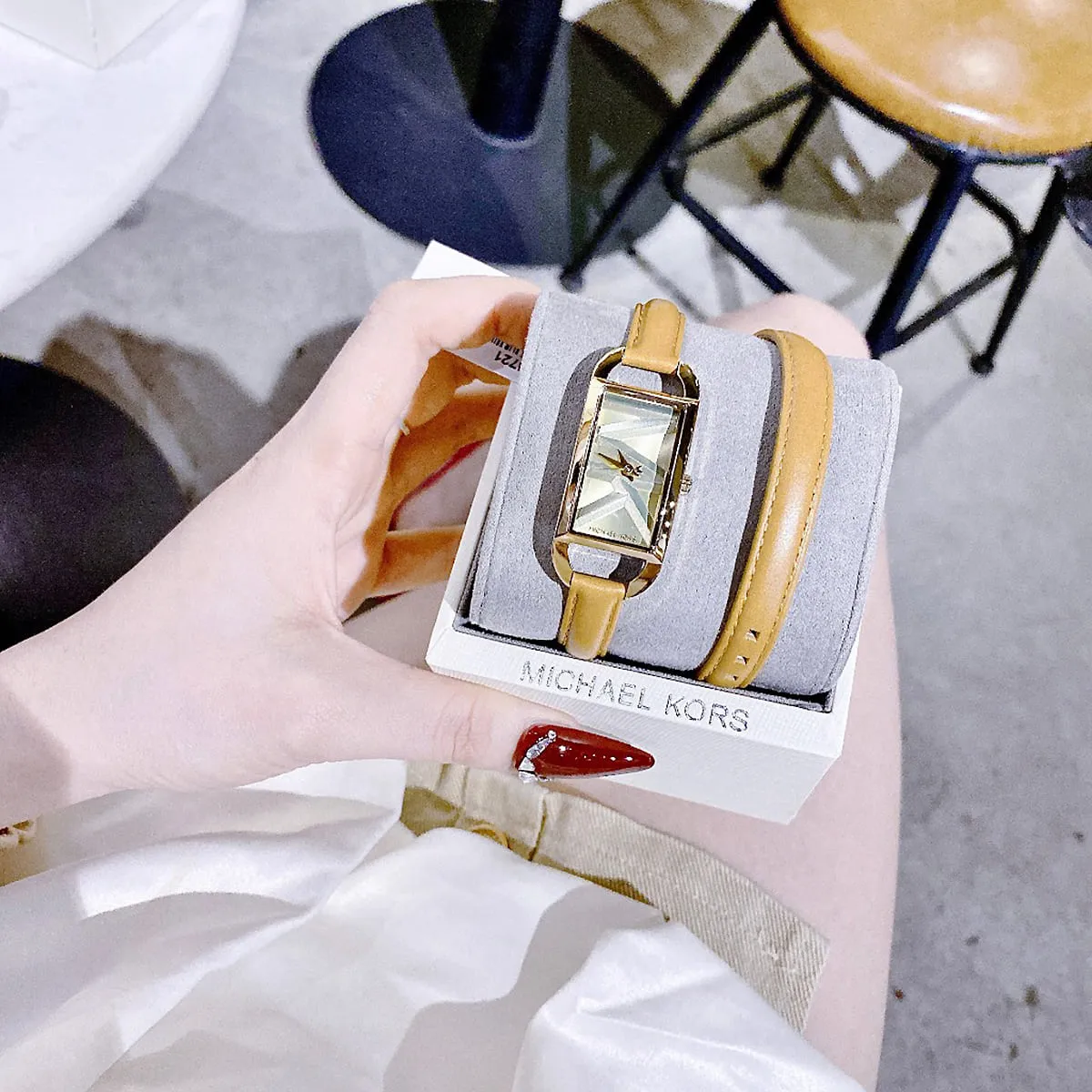 تتميز الساعة بأستيك جلد ذو التفاف مزدوج و شعار MK